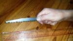 A 31 gram 6″ hiking/hunting saw sounds pretty good doesn’t it? Complete with handle and sheath it cost me less then $A9. The Diablo saw blades are A$17.47 per pair in the Tools section of Bunnings. I will try to find an even better blade next time. Holding it in the vice I carefully cut just enough of the teeth off with the angle grinder so I could hold it comfortably. A pruning saw cuts on the ‘pull’ stroke so it should be fairly safe to use.
