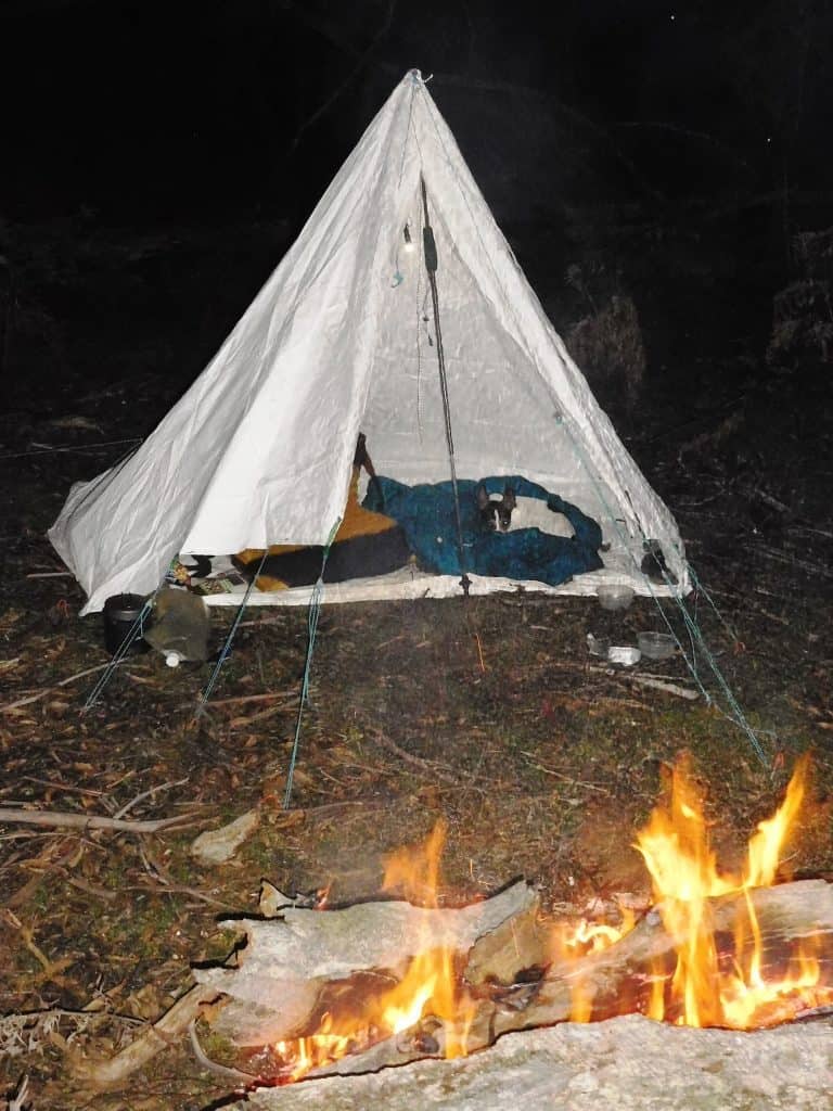 Spot enjoys the fire, and my sleeping bag. Always hard to get him off/out of it and into his own at bedtime.