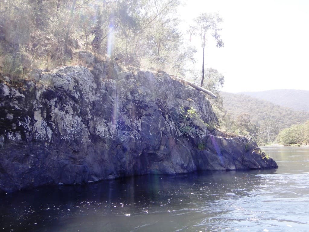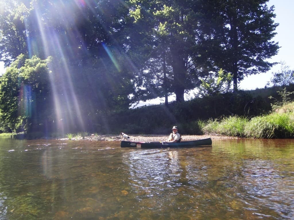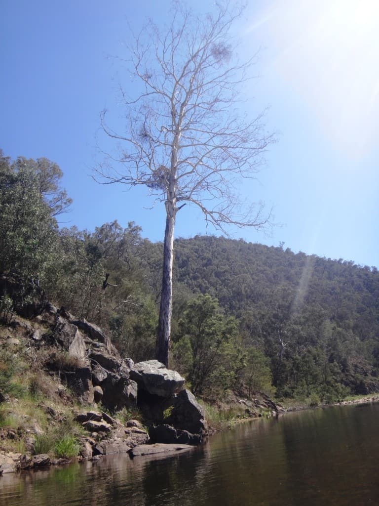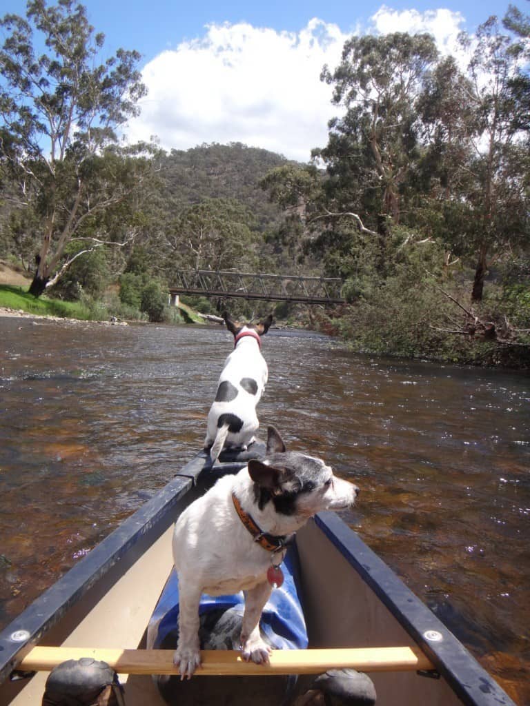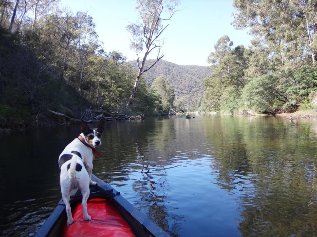Just as we were about to come out into a view of the large clear hill on the right where the old Telstra facility used to be, there was a tiny finger of bush between the road and the river – I guess no more than 1/2 an acre. Spot began barking (something which he hardly ever does), wanting to jump from one canoe to the other, jump into the river, onto the bank… Of course we were snapping back at him.