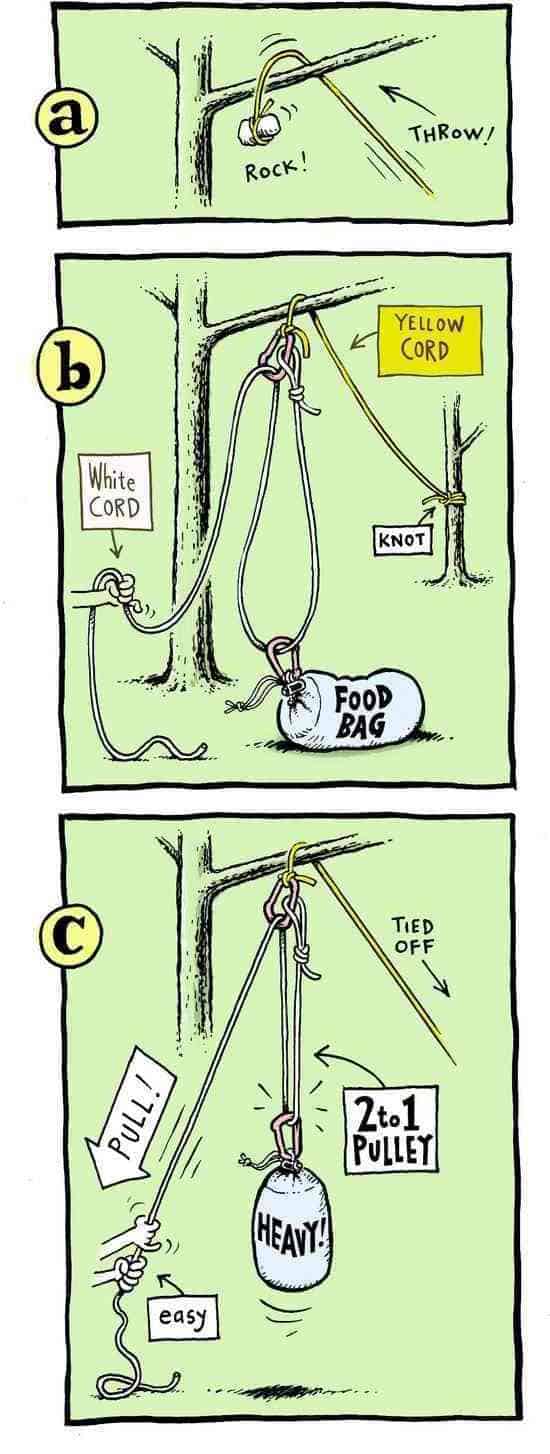 The idea would also work well when you need to hoist a deer carcass from a tree to ‘set’ overnight, or etc. This is a difficult enough job for one, but a 2 to 1 mechanical advantage would make it a lot easier. Using a Spanish Windlass also makes the job a lot easier.