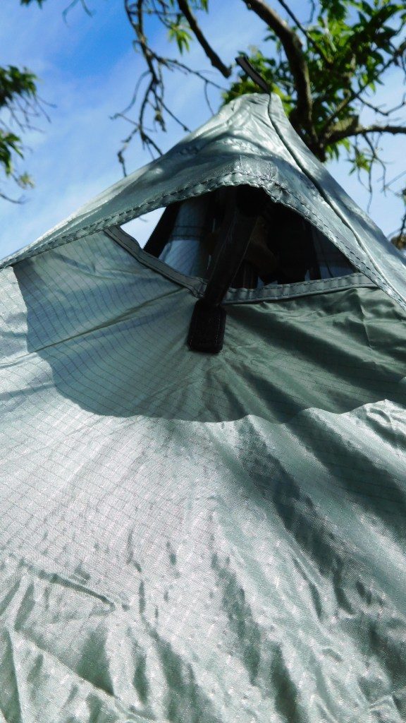 It has two triangular vents at the peak which are held open with short light props secured with velcro – a top idea, which I will copy!