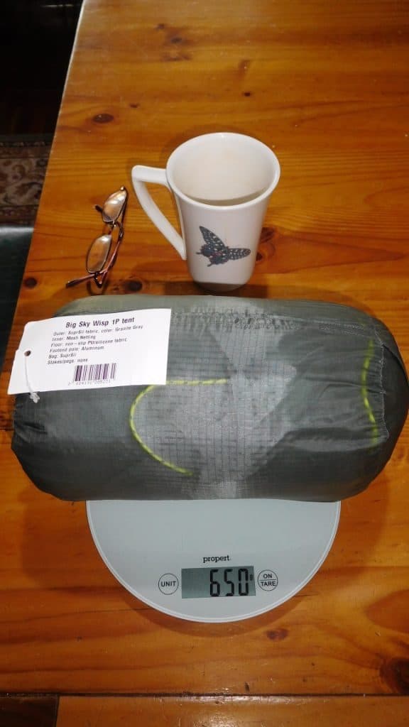 I added all the extra guys you could ever need. The tent comes with lots of extra tie-out points. It can be erected with just 8 shepherd’s hook pegs but can be secured against the “Roaring Forties’ with a total of 17, if you wish. With the added guys and the micro line locks it now weighs 650 grams (probably with a bit of grass and dirt from my boots still attached), and is as you can see a bit smaller than a large soft drink bottle.