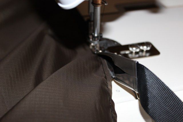 Using the polyester binding tape bind the ridgeline either by hand folding or utilising a binding attachment suited to your machine. Make sure you leave about 100mm at either end, though I recommend cutting it longer than needed now and you can trim to size later. You can also double stitch the ridgeline if you choose – which is what I did.