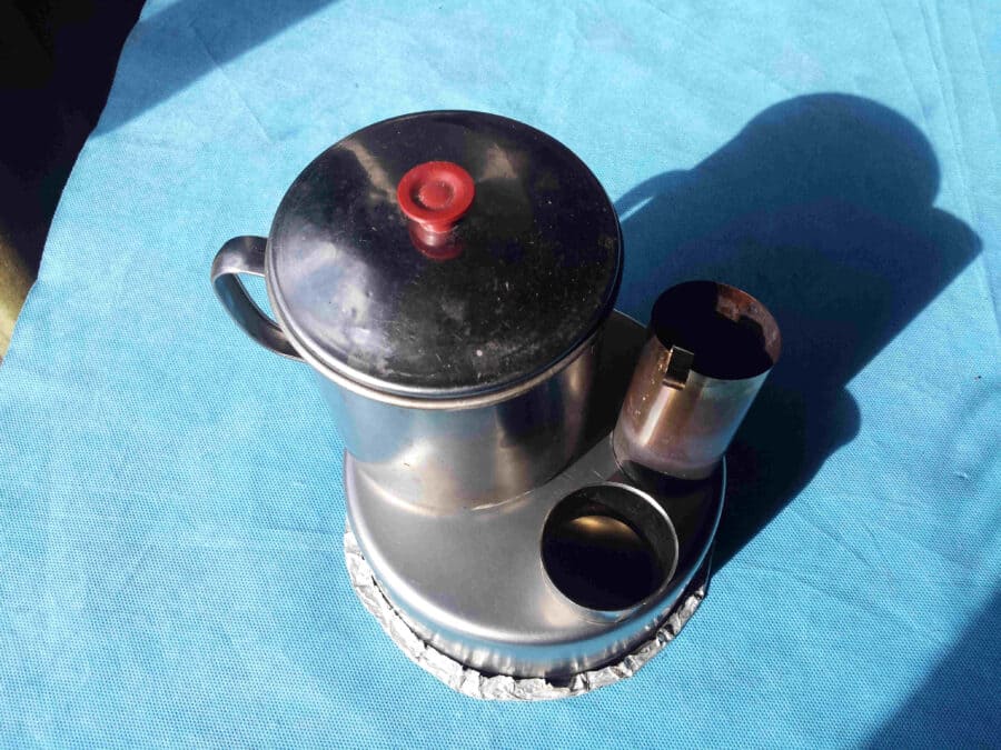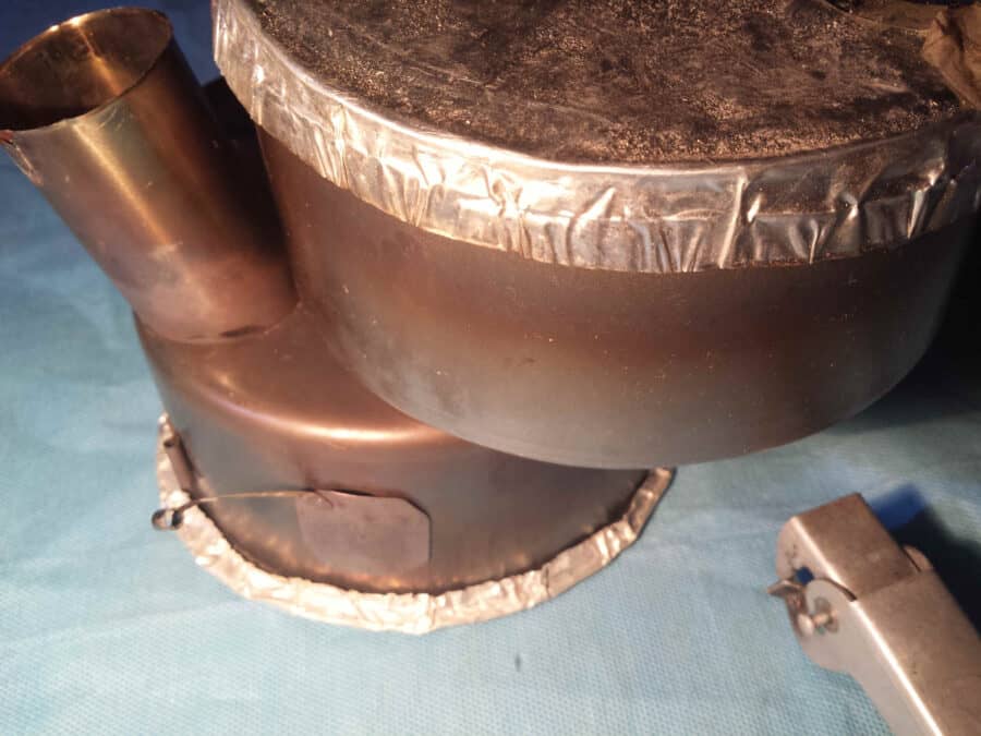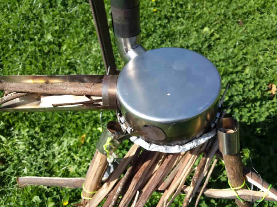 The stove bottom can be removed to store things inside it while backpacking. The stove is designed to work with a 40mm diameter roll up flue pipe. The stove is easy to start and can boil 250 ml of water in about 5.5 min.
