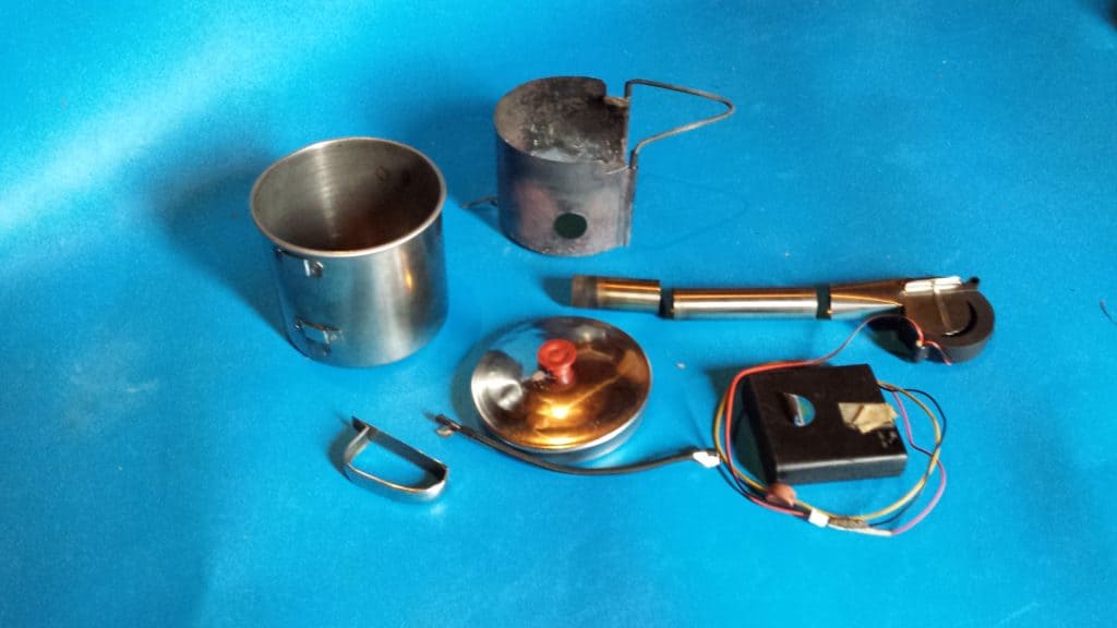 Here are the components of this tiny stove (from left): mug, (sans handle), lid, stove, blower, power supply. The blower utilises a USB laptop fan and a rolled titanium foil tube. it only weighs about an ounce. You could power it with a single 18650 power bank such as this one which would weigh about 60 grams including the battery.