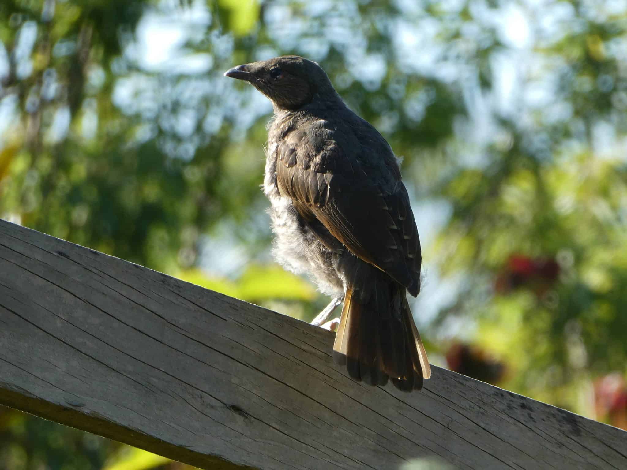 (Della) “We often see satin bower birds in the garden at fruit-ripening time, but yesterday gave us a special treat: I discovered a hesitant fledgling bower bird that had been separated from his frantic mother by a flock of noisy cockatoos wheeling overhead. Mum was flying about and calling from a nearby tree, and you can see her join her baby in the video before being frightened off again by a lone cocky.