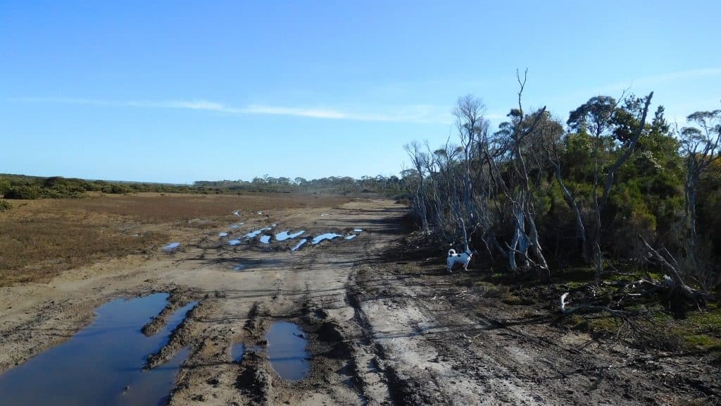 On Sunday we spent a few hours in preliminary exploration between Port Albert and Welshpool. It seems like it will be possible to walk from Welshpool to the track at the edge of the private land which runs down from Old Telegraph Road to Port Albert. (It is very hard to spot as it appears at first to be someone’s driveway). From that point you could easily paddle across to the caravan park at Port Albert in your pack raft or you would need to walk back to the main Highway to cross the bridge over the river (water, toilets), then continue on towards Port Albert taking the first exit to the right to the Caravan Park then walk along the Old Port Walking Trail into Port Albert (beer, fish’n chips). There are two small streams to cross which would usually supply water (probably) needing filtering.