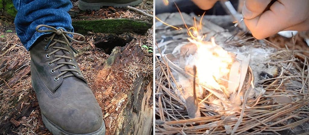 Put a fire starting kit on your feet. When out in the wilderness, it can be a good idea to take along a backup fire-maker, just in case your matches get damp or rubbing sticks gets you nowhere. With this in mind, Survival Laces include a small fire starting kit, and some fishing line too, just in case you ever need them. Of course you can also do all the traditional things with them: hang yourself, garotte a companion…EVEN tie your boots: https://www.kickstarter.com/projects/1268063329/survival-laces