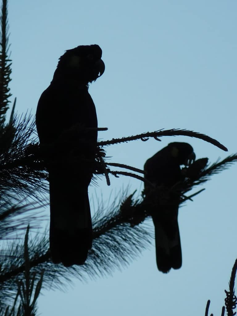 Thanks to my children I received a new (birthday) pocket camera, a Nikon S7000 with 16 Megapixels and 20X zoom which weighs 162 grams complete with battery, micro SD card and wrist strap. I may now get a chance to take (& post) some snaps of astonishing things I sometimes see in the bush which I could never bring into clear enough resolution before. Here for example, is a pair of Yellow-tailed Black Cockies seen at sunset on our walk last night; (more to follow):
