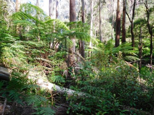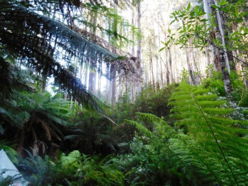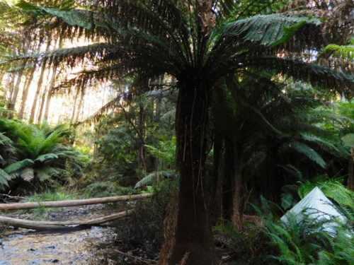 S/he writes: ‘It is about 11,000 steps in from the main road to here, some very short ones as the terrain is quite steep in places, particularly the last few hundred metres. There is also some horizontal scrub to negotiate, very tricky unless you are shown the way, or keep a careful look out. On the way in you walk North across the head of a gully then follow the ridge (just north of centre) sloping roughly NE for a couple of kilometers until you reach the top of the first waterfall, one of six falling a total of over 250 metres, the highest in Victoria. There is a very small spot you might pitch a tent about fifty metres before the first fall. A hammock or two could be pitched at the falls. There is no water for the next 9,000 steps till you reach the Yarra confluence.
