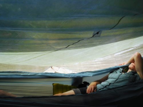 Della is reclining on a Nano 7 hammock here (https://www.grandtrunk.com/products/nano-7-hammock) which (with the caribiners removed and with dyneema ropes attached) weighs 187.5 grams. I would just throw one of our Thermarest Neoair Womens mats (340 grams) in it and a Montbell Ultralight Super Spiral #3 down sleeping bag (600 grams) for a perfect night’s sleep (Total: 1327.5 grams). Perhaps you would like to compare that weight to your current tent, sleeping bag and mattress combo! My arrangement is also much more comfortable, safer and drier. She has one arm thrown over her face as the sun is quite bright. This is one disadvantage of cuben: it is so thin that for a summer roof it provides little shade in the daytime – but there are always trees. The converse of this ‘deficiency’ is that it is a lovely airy shelter on more inclement days when another tent might be dark and grim.