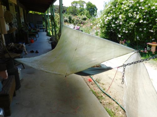 My first homemade hammock and hammock tarp were both fashioned from some green 2.2oz/yd2 nylon ripstop from Spotlight (you can see what it looked like in the ‘poncho shelter’ link below). We simply cut the required length for the hammock (leaving the full width of the fabric 5′ – 150 cm), folded it over and double hemmed it at the ends (to take the rope). The selvage was enough for the sides. For the tarp we used a 7′ x 7′ (210 x 210 cm) square flat felled at the join and hemmed all round, to which we sewed grossgrain tie-outs at the corners and halfway along the sides. This arrangement worked fine for years and in all kinds of weathers hunting sambar deer in the Victorian mountains. Indeed I have been bone dry under this minimalist tarp when a couple of fellow hunters were soaked to the skin inside a tent pitched under a tarp not ten yards away! I am talking a tarp of 49 square feet here – and some of that area is almos6t certainly superfluous! In cuben 49 ft2 would weigh 2.7 ox or78 grams! Now you see what my 300 gram ‘limit’ is about!