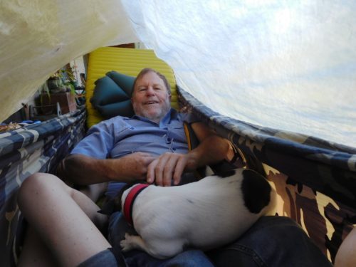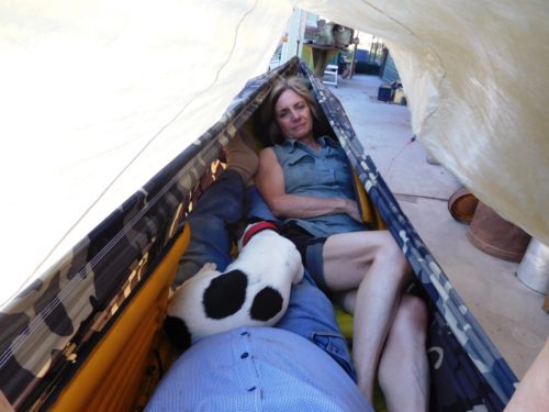 As you can see, Spot figures there is plenty of room for him too – and he’s comfy! This is a Trek Light Gear Double Hammock (https://www.treklightgear.com/double-hammock.html). We were playing around with mattresses here. Della is lying on a ¾ length Neoair. I am on a Neoair Womens. We are using the new Klymit Ultralight pillows (http://www.theultralighthiker.com/klymit-ultralight-pillow/ ) and the Airbeams (http://www.theultralighthiker.com/air-beam-pad/ ) from our packs (both of which we would be carrying anyway) for side insulation on the side where our sleeping bags will be compressed. It is comfy enough.