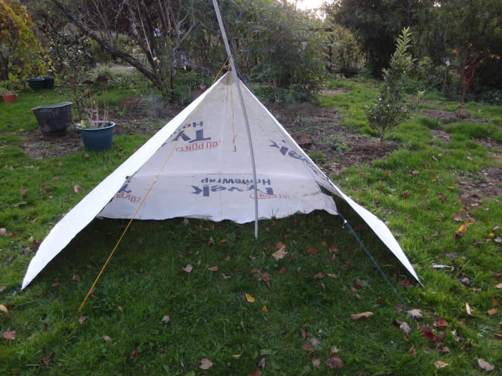 You will never have a cold back as it will reflect the heat from the fire right back at you, and keep you warm all around. I have been sitting in mine in shirtsleeves on sleety nights when the mercury dropped below 0C. I have also been out in it in torrential rain and hideous winds. Most places (except the tops of hills – never a good place to camp) the wind blows pretty consistently from one direction – check the forecast before you go. If it does turn around you can close in the storm flaps. If it turns 180 degrees, you may have to re-erect it, but closing just one of the storm flaps may allow the wind to just scoot by instead of funnelling the smoke into the tent. You just tie it to a tree, any stick over about 1.5 metres, two hiking poles joined together & etc. You (at least) need 8 stakes (including two for the storm flaps). Take 9 – one can always go missing. You can certainly scale this up to suit two people, but you will have to sew the wider floor on if you make it wider eg the top piece might be 2.4 metres high and 4 metres wide and the floor perhaps 1.5 metres wide. In that case you would need 5.5 metres of 3 metre wide Tyvek. I WILL expand on this later after I have done some more experimenting. See also: http://www.theultralighthiker.com/tyvek-twin-fire-shelter/ Hang in there…Della Jones’s winter garden looking lush in the background of the photos…