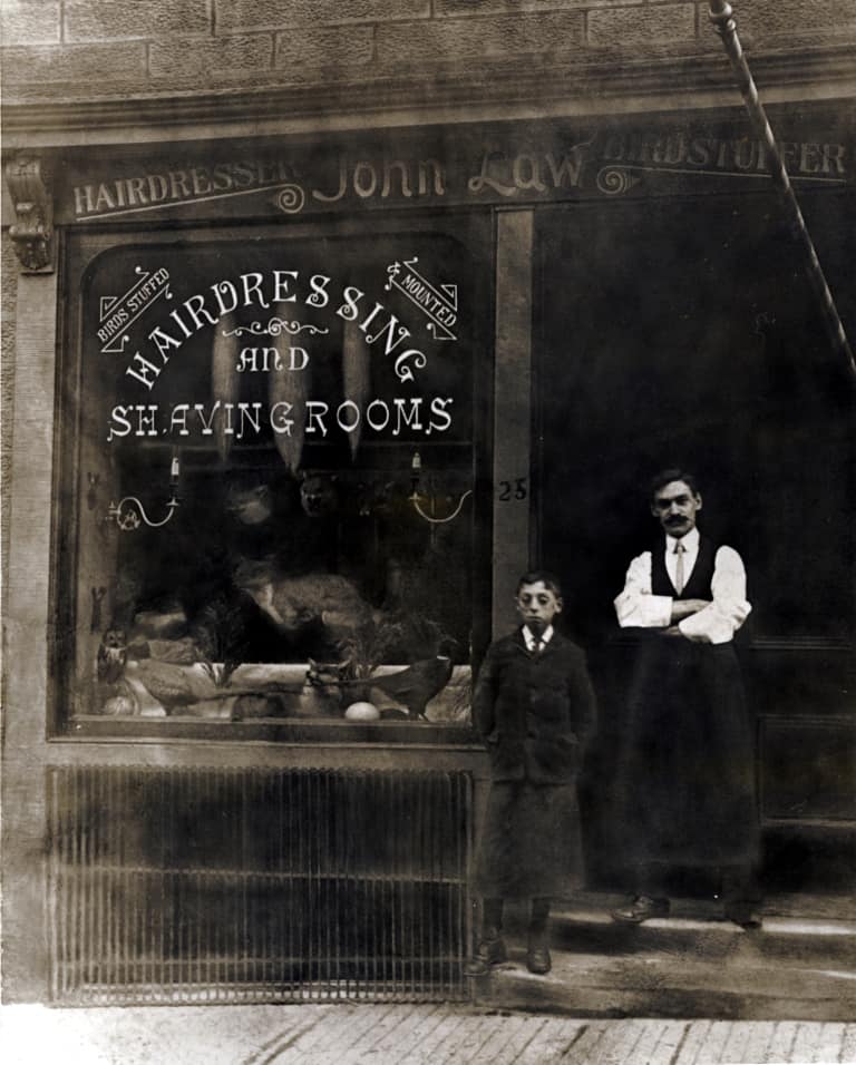 Della just loves stuffed animals which is maybe why she has kept this particular stuffed old animal around for nearly fifty years! It may be a family trait. We have this wonderful family photo circa 1903 of her grandfather as an apprentice hairdresser in Hawick, Scotland outside Richie Law’s shop. As you can see the other specialty of the shop was taxidermy!