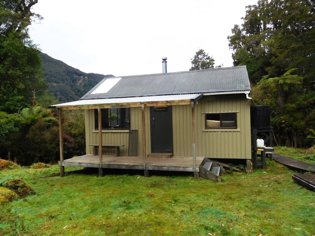 The Hauroko Hut, a comfortable hut a minute’s walk from the lake and the burn.