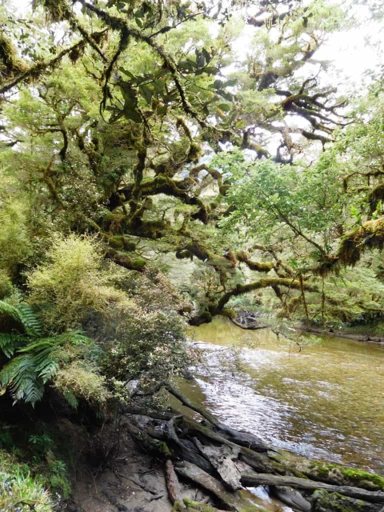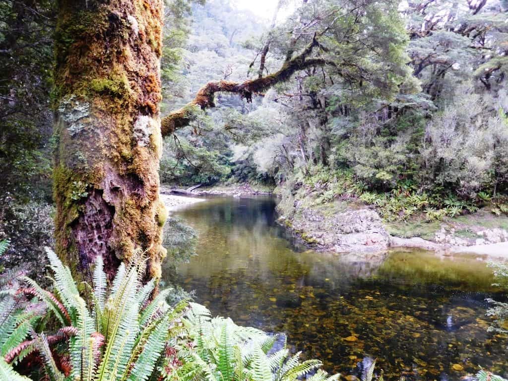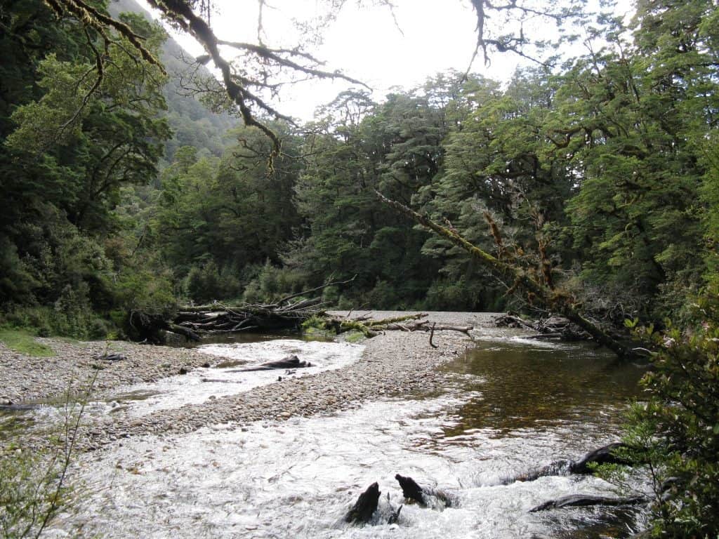 Track times are pretty fluid as with many NZ tracks. For reasonable fit people of my age (68) it is rare for a section to take less than six hours, and some will take more than 8. If you have a late start here, it might be better to wait until next morning so you won’t have to hurry. That way you could also do some trout fishing in the Burn which the track parallels for many hours. It is possible to walk along in the stream in many places, then rejoin the track – if the water levels are low. The sign on leaving the Lake reckons about 6 hours to the Halfway Hut, which I reckon is about right.