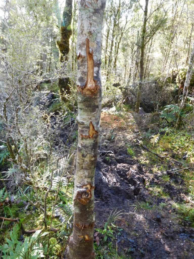 The Elusive Fiordland Moose: Along the way there is sporadic moose sign if you are alert and keen eyed. Nothing else could reach up 2.5-2.7 metres (8-9′), break off branches as thick as your thumb and strip them, or devour all the lower vegetation of their favourite broadleaf plants, or systematically bark trees, or leave footprints as big as a cow’s.These solitary leviathans yet roam these forests unseen.