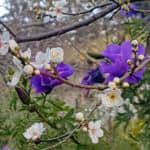 (Della) ‘Well, the minus 2 temperature did feel a bit intimidating this morning, but looking out the bedroom window to a little spring blossom certainly cheers the heart to start the day! This is just a wild plum that grew up in the hedge outside the window as a result of total inattention during the busy years of full-time work. Now that I enjoy its no-nonsense life-force every morning upon waking, I wouldn’t swap it for a more dramatic yet fussier specimen. It brings a host of birds to entertain me as they eat its summer fruit and squabble over territory and I do love the subtle harmony its spring blossom creates with the enthusiastic flowers of the native hibiscus. I have been watching the buds preparing for spring launch over the last 10 days or so and can now announce that it is officially spring in Jeeralang Junction’