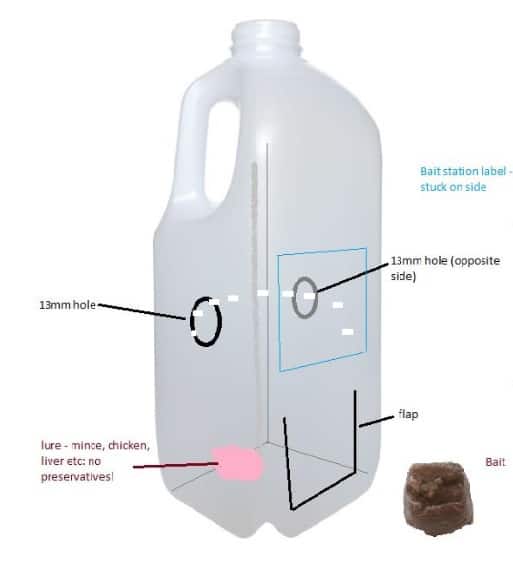 ‘For those who would like queen lure here it is again:Use a 1.25 L soft drink bottle with 3, 10mm holes, approx. 150mm from bottom of bottle. Make up a solution 8 tablespoons of honey in hot water with a 2 teaspoons pure vanilla essence Queen red label 35% alcohol this will do 4-5 traps, divide bait between traps, top up with water to just below holes replace cap and hang in a sunny spot in garden, near water. Fruit trees with curly leaf is a good place, bait will take a week or so to activate. Shake every few days to let bait dribble out .keep in place until January. Strain out when full, reuse and top up bait with water. Replace bait every 4-5 weeks Will also catch workers Jan-April plus flies.’ European Wasp Control Project Facebook Group: https://www.facebook.com/groups/927515897312332/