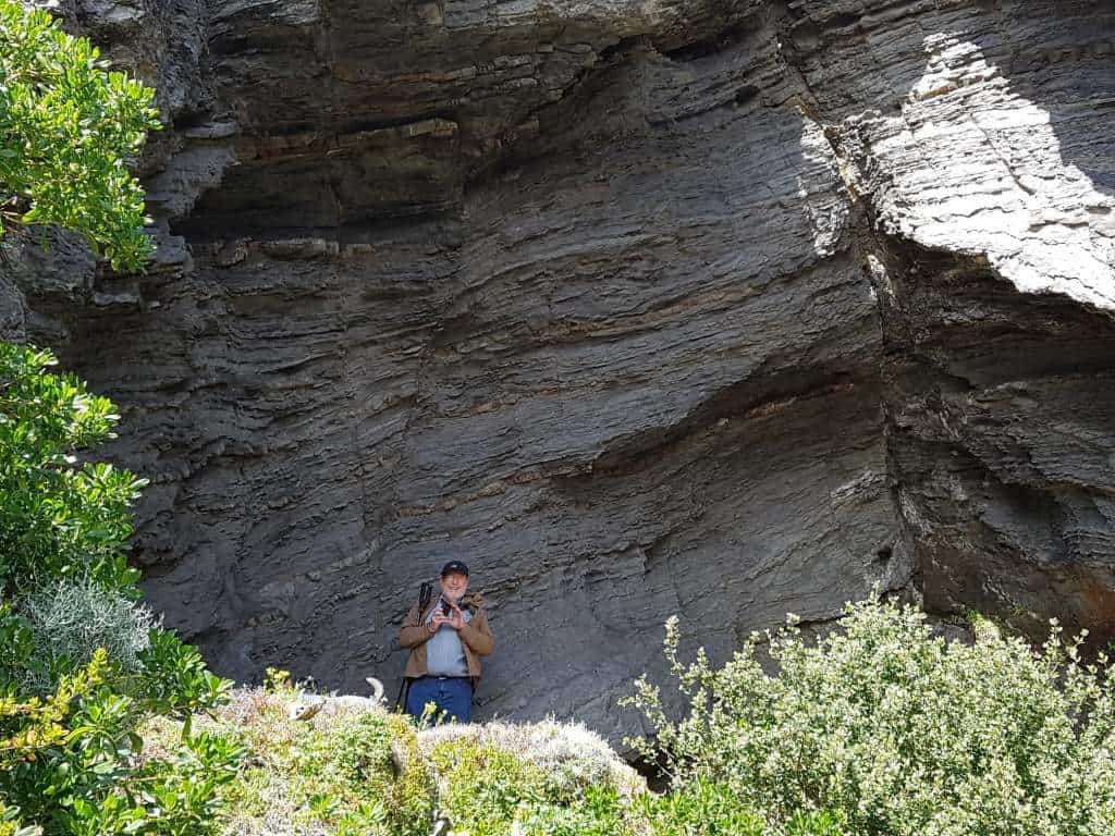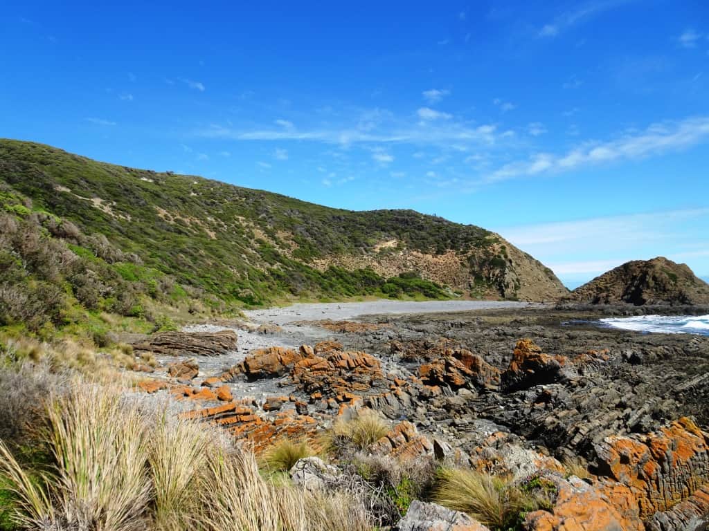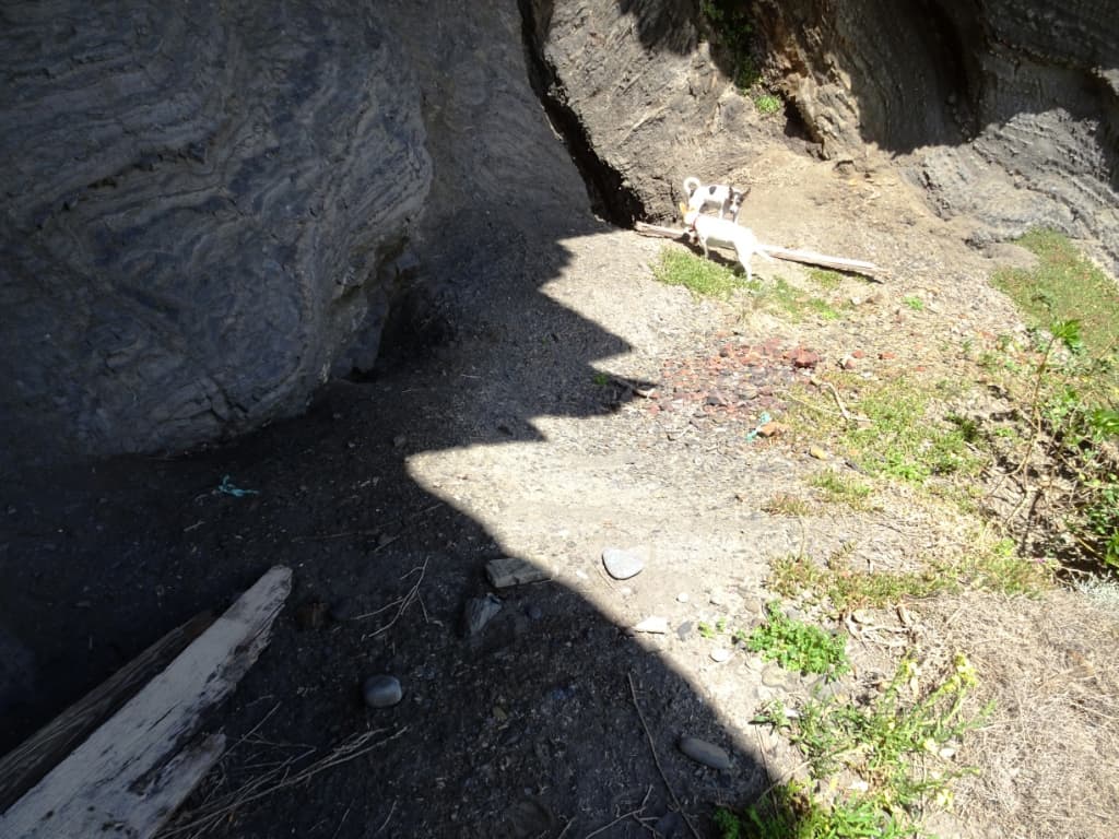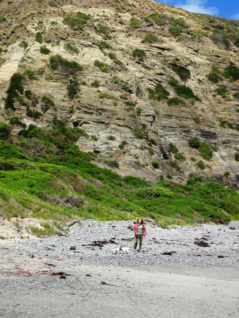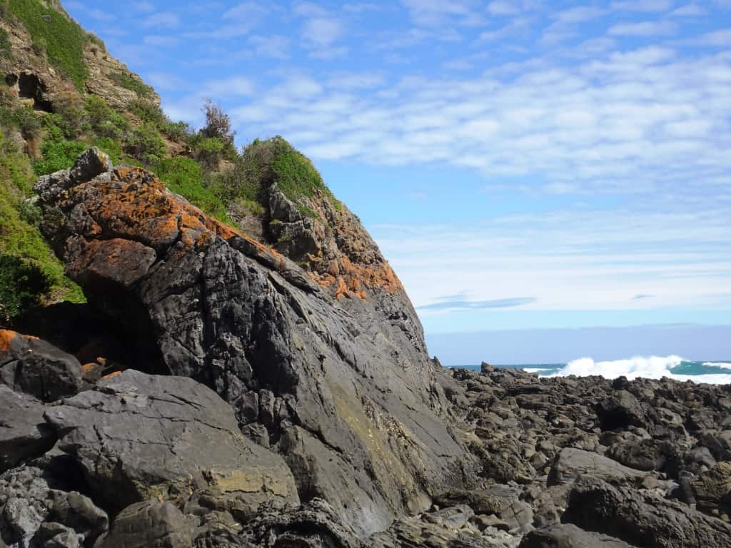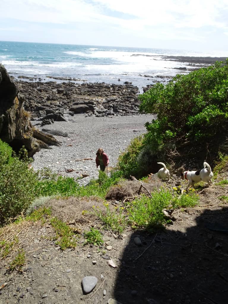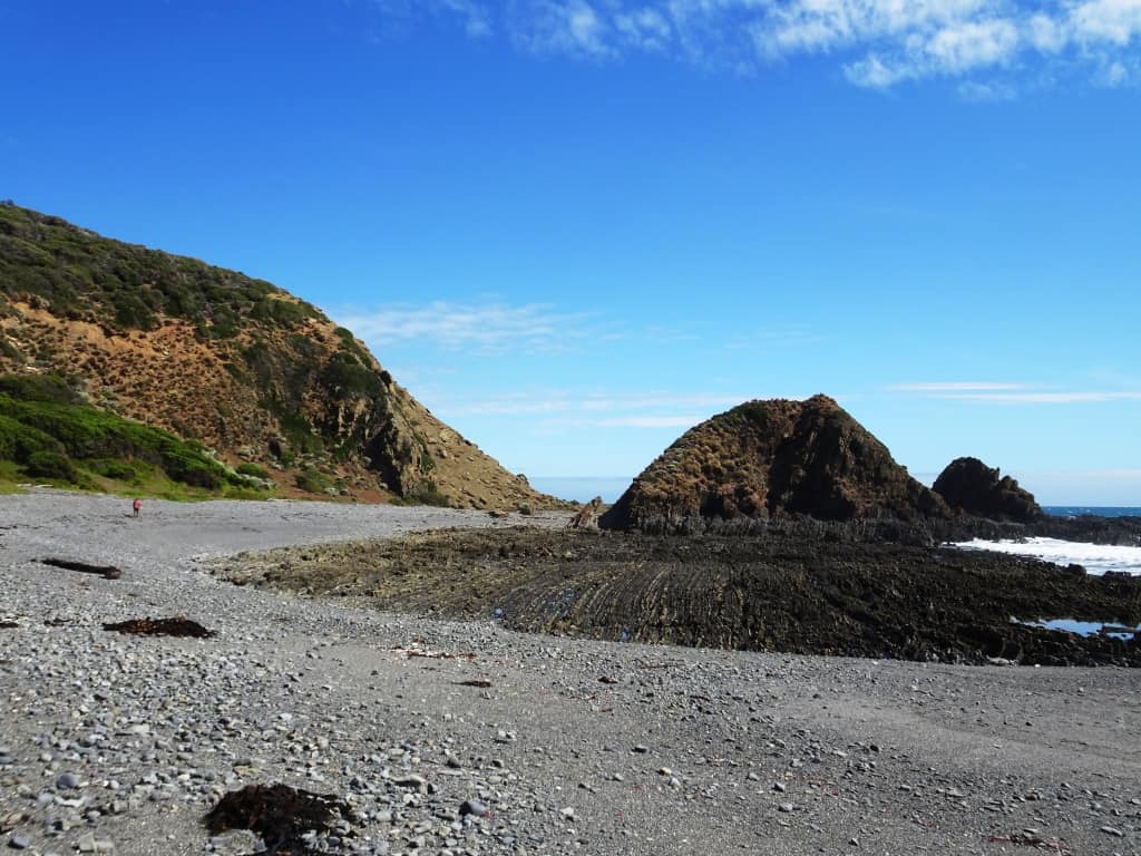 Once you are on the beach the going is splendid (even with a crook knee and back). To your left you will see a sea cave in the beetling cliffs. It contains a rock bivy you could use for an overnight camp (if you have brought water with you).