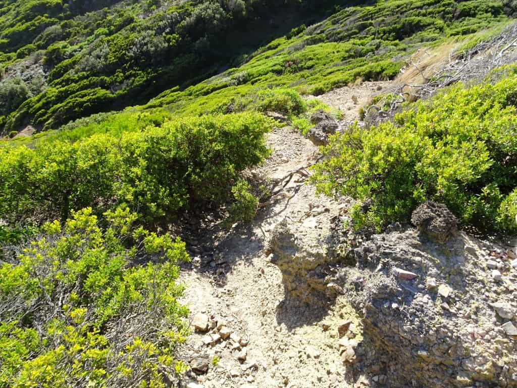 After you pass by the locked gate (to prevent vehicle access) and a bit of dense shrubbery you will come to an open ‘lookout’ which used to be a camping area – one of many which have been closed as the public continue to be denied access to their lands. You can see the grassy path along the other side of the gully to your right from the top. You have to get down and over to it. There are only a couple of ways. The best is to take the path down to your right and cross high. If you take the path to your left and down you can still cross but it is steeper and thicker. If you are coming back, pay close attention, as it can be tricky finding the right wallaby track to ascend on! Hint: both could use a little bit of machete work (See: Nuts to Leave no Trace).