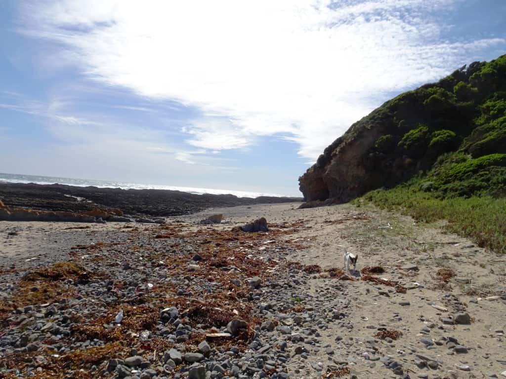 As I explained in the earlier post, there is a goat track down to the beach starting at the locked gate 100 metres back along the road from the lighthouse carpark. Parks Victoria plan to have a continuous walk from Venus Bay along the coast to Bear Gully – and on, but it requires work – as well as planning! Thousands of employees are not sufficient to get any work done – though they can invent more and more rules. It may not be ‘legal’ to walk along this beach, or to camp, have a companion dog with you, catch a fish or pipi. I have long since lost interest in keeping up with the plethora of rules and regulations or paying attention to them. I will pay the fine as my price of admission if ever the day comes!