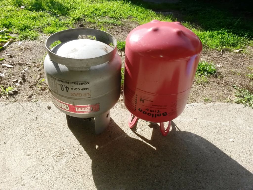Maximum surface area is achieved by lying the helium bottle (2.3 kg as compared with 4 kg+ for the propane bottle – both are steel) on its side. You would then cut a slice off the top so that you could weld a flat top on. It can hang over the edges and front so that you can simmer.