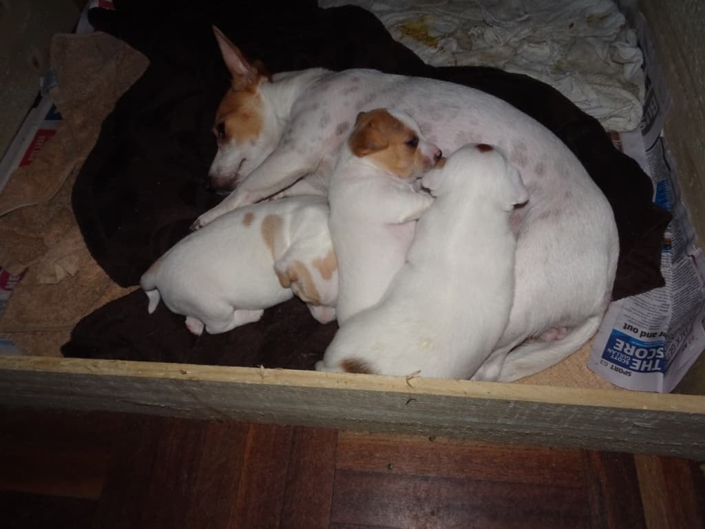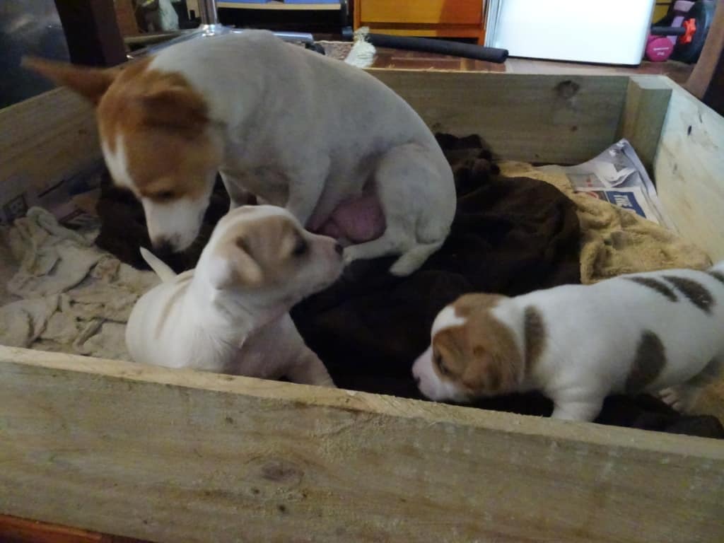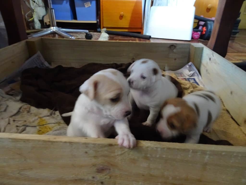 (Photos/Video Added) 3 weeks old, eyes open, 3 little bundles ready to start some supplementary feeding (to give Honey a bit of a break) and take over the house…for a little while! Thanks to our daughter for the super photo! One of the puppies is already spoken for with nearly a month to go before we can advertise them. If you want one, please let me know. Two girls and a boy: Milky, Dot and Little Spot. More photos to follow. Check back later…