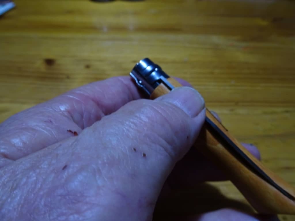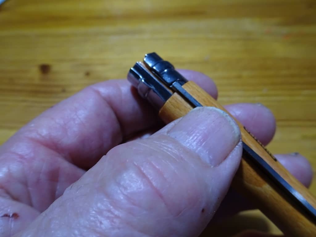 The first thing I discovered was the unique blade lock. I had seen them in the shop and passed them over as I thought they didn’t have one. Instead they have what might be a superior one. At least there is no way this blade lock is going to fail and leave you with severed fingers – as can happen. You can see in the photos I took below how the ring-type lock they have works. They call it the ‘Virobloc safety ring’. You just need to rotate it to make the bade stay in the open or closed position. Just hook it around with your thumbnail (as shown) though as it wears a bit it will become easier to rotate.