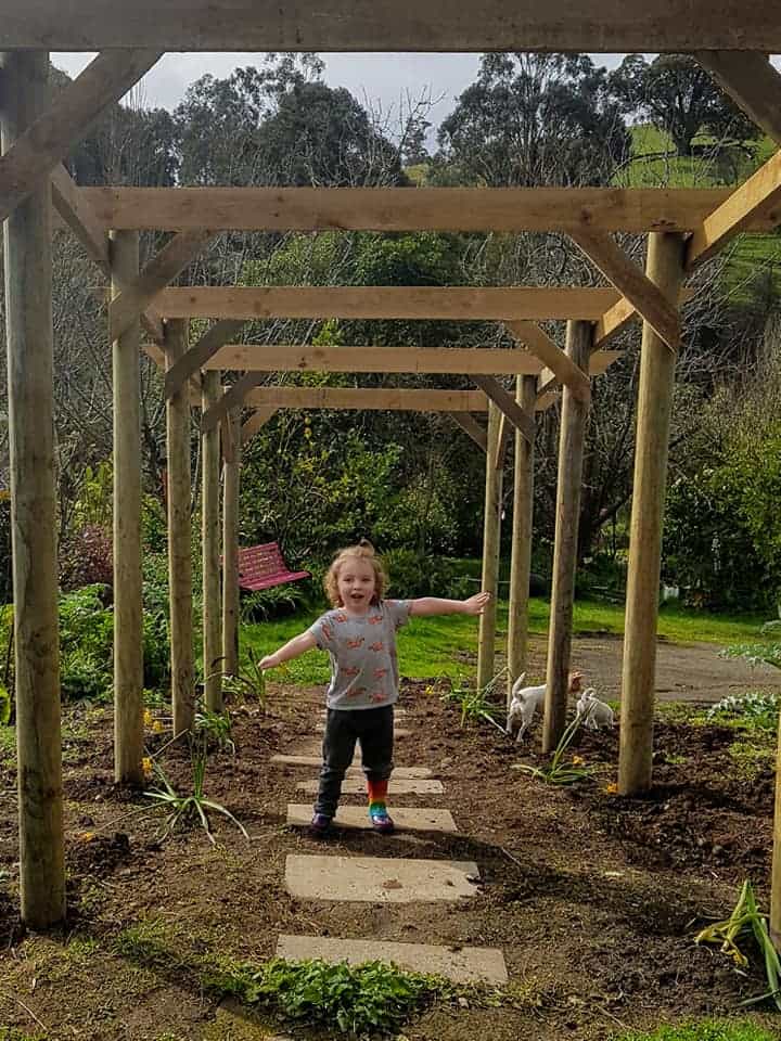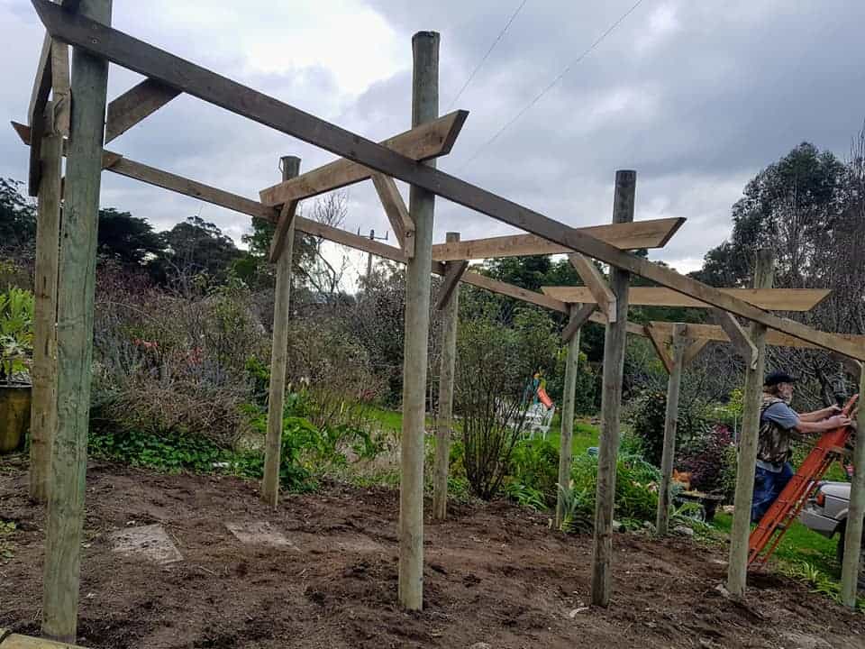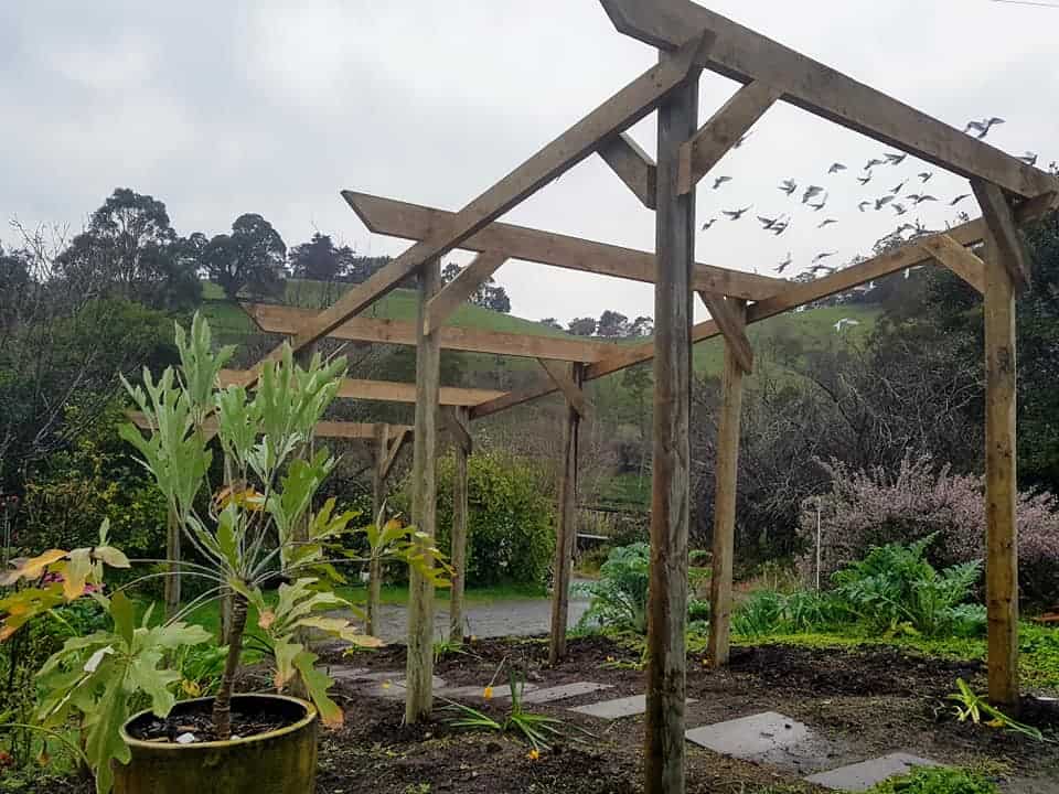 ‘After 28 years of being front and centre of our house, our old archway has been demolished, to be replaced by a new one. Steve built the original out of gal water pipe and concrete reo covered with poly pipe, and I enthusiastically planted it out with climbing roses each end and potato vine between.