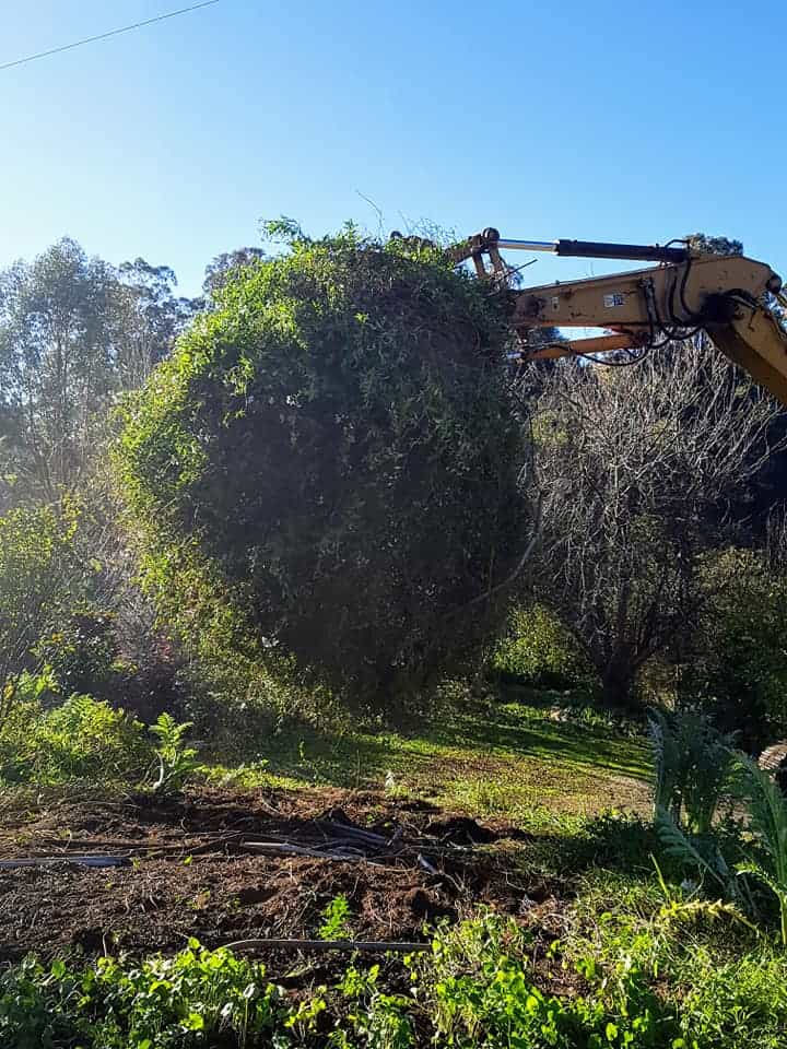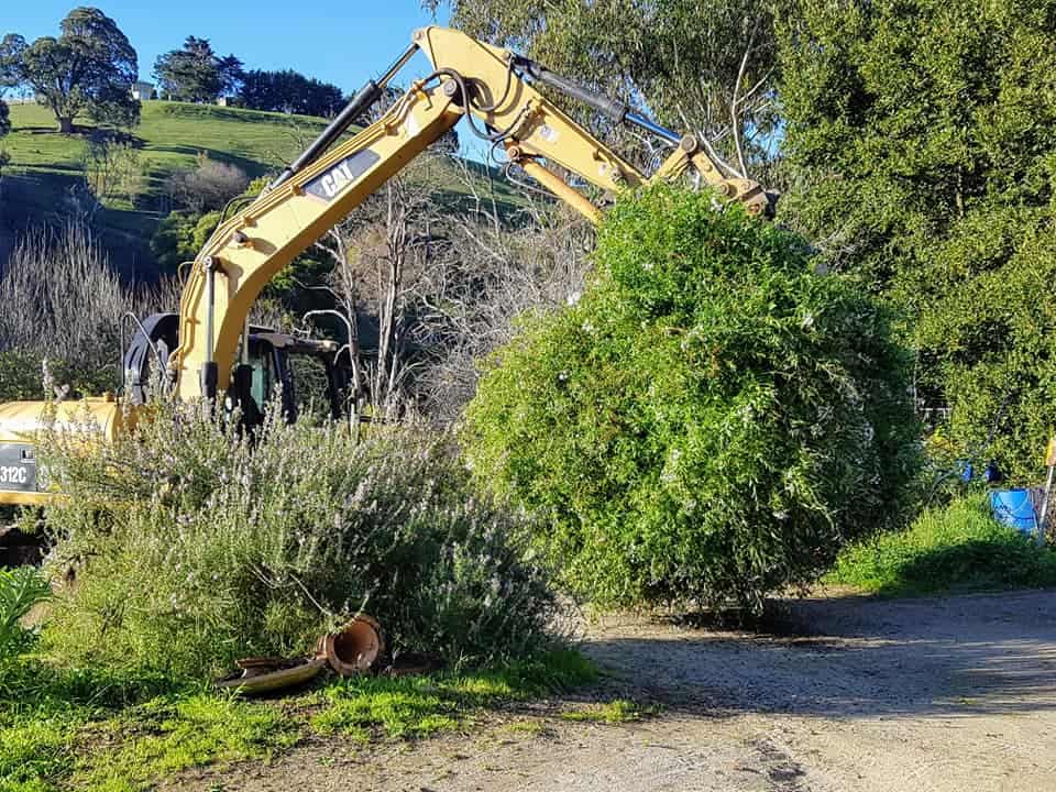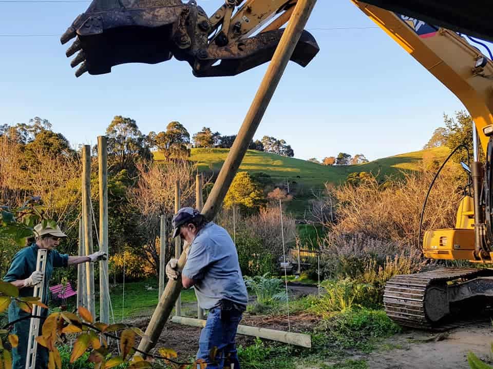 Its removal was the work of less than 5 minutes: one large munch, a roll of the jaws and a lift up and out. And while the excavator was here, Steve arranged to have it dig in the supports for the replacement walkway which he later finished with some carpentry.