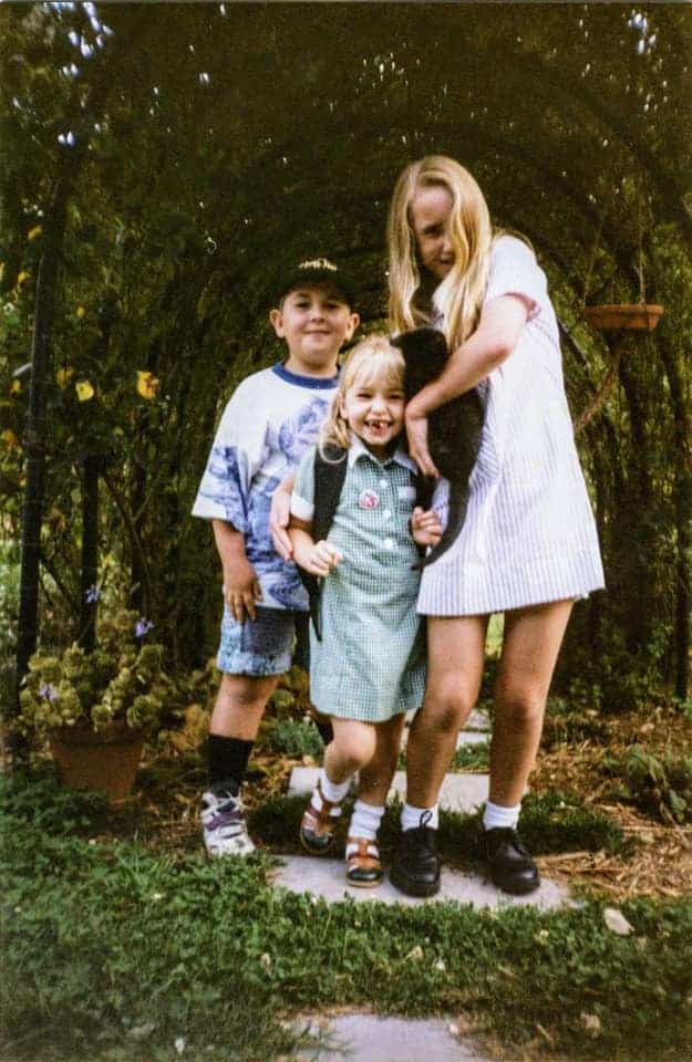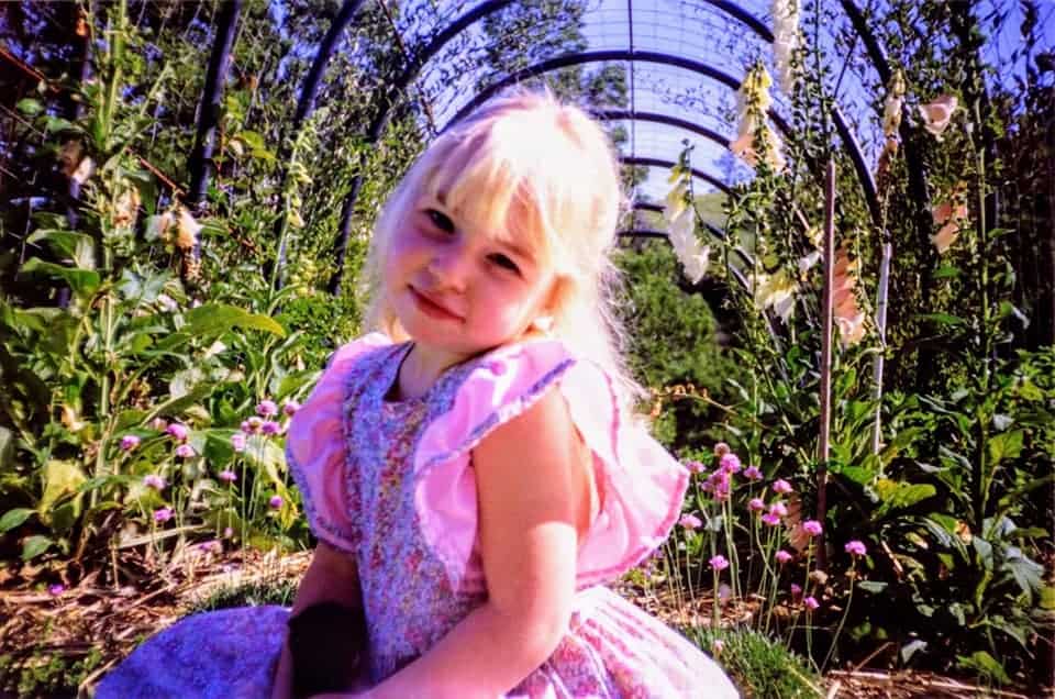 The accompanying pictures, beginning with a 3-year-old Merrin cradling her kitten “Blackie”, document the aging of that archway. Within 2 years, when the 3 children are pictured on their first day of the school year, the sky has been all but obliterated, and from then on, despite my constant battle with shears and secateurs, the potato vine took over, smothering the roses and creating a dense, tunneled thicket that became home to dozens of starlings.