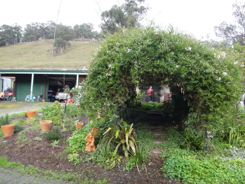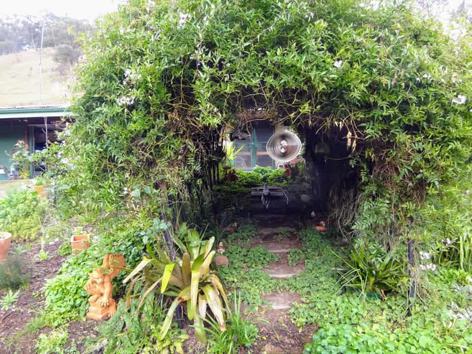 The arch was very simple to construct, and we do need more of them, one leading down to the shed, for example – a job for another day…I marked it out, drove 3’ lengths of ¾ gal water pipe into the ground vertically to half their length, then slipped the required length of concrete reo inside them (to form a hoop), and lengths of 1 ½ inch poly water pipe over them, Surprisingly each arch is strong enough like this for a large person like me to swing on. Having made a row of them, we simply clad them with light gal weldmesh (attached with cable ties), planted the potato vine/s, and voila! You used to be able to walk up pavers through it from the ‘guest’ parking below to our front door, but over the years Della has so cluttered it with interesting decorations this may no longer be possible…