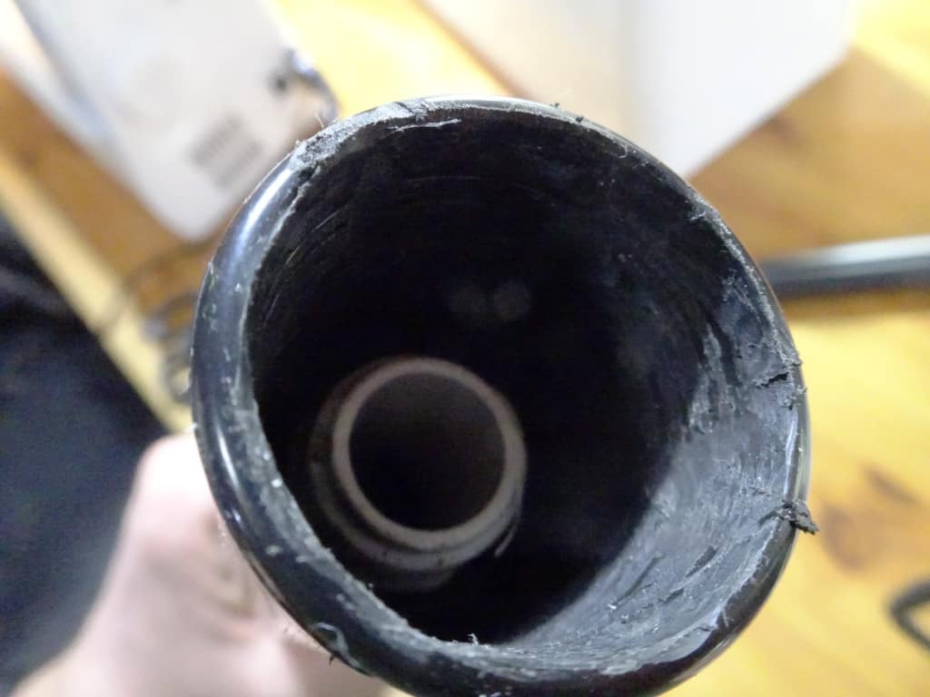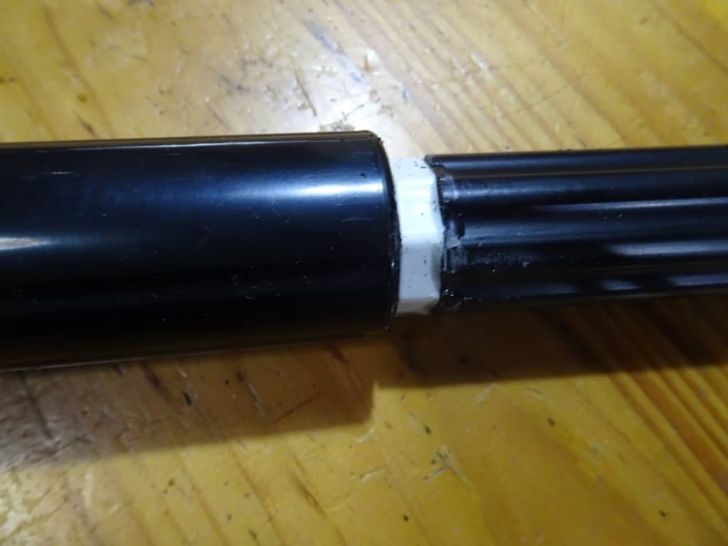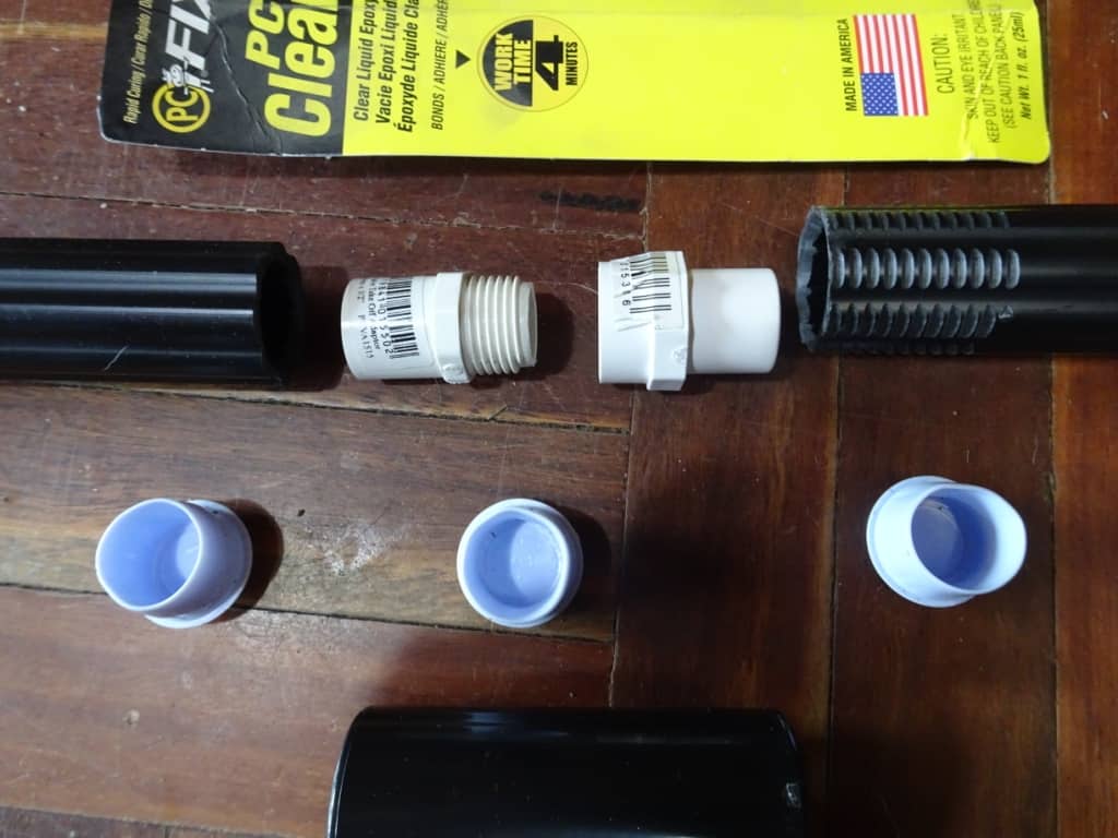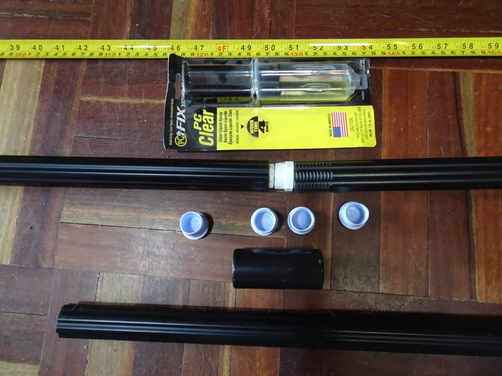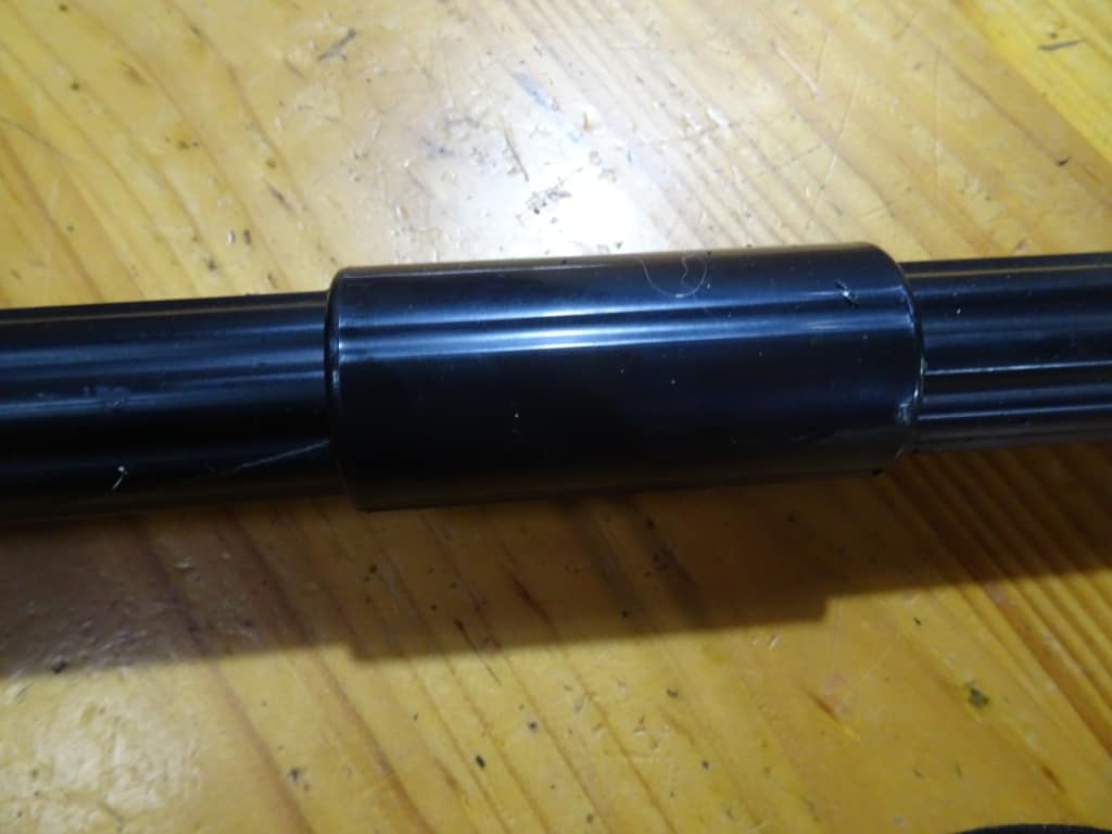 If you join three lengths together you get a double paddle which is 6’9″ or 2.09 metres long – just about right. Four is too long. My latest expedient involves two cheap plumbing fittings bought from Bunnings for a few dollars glued into the section ends with some epoxy. I believe this is the best solution.