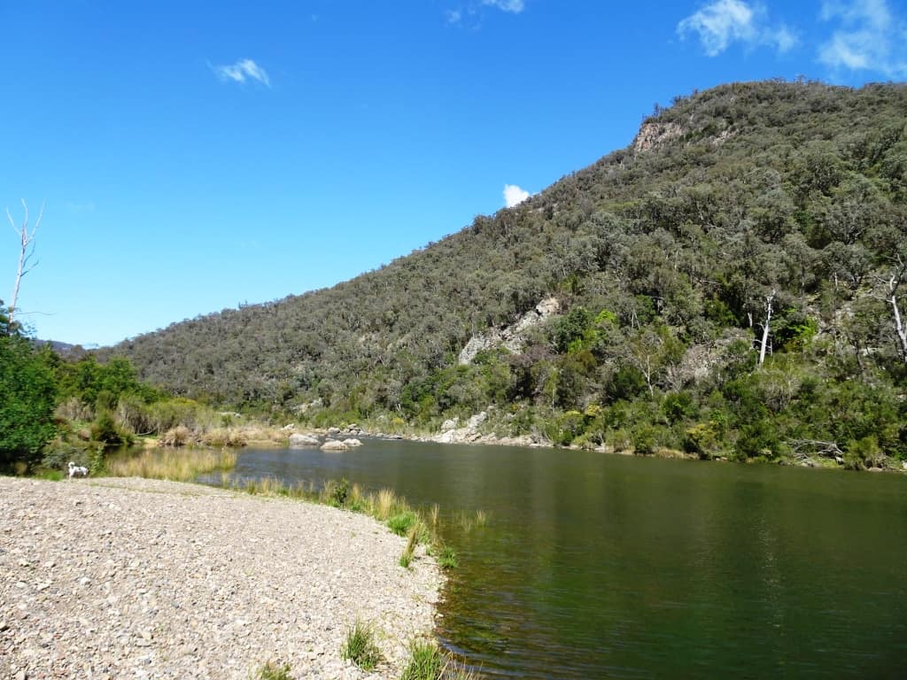 This is the bottom end of the flat looking across at another flat downriver. If I can get down the gentler ridge (right) to here this will make a better base and camp. It is also easier and closer to get across the river here. There is a good screen of bushes opposite behind which I can set up a camp.