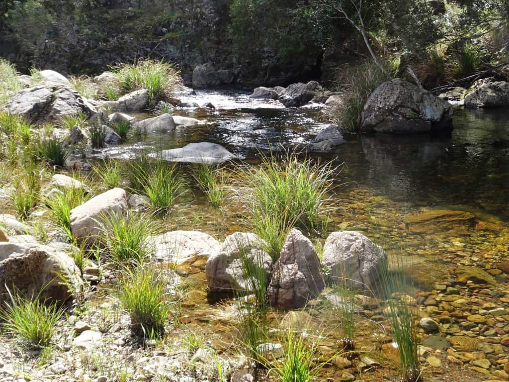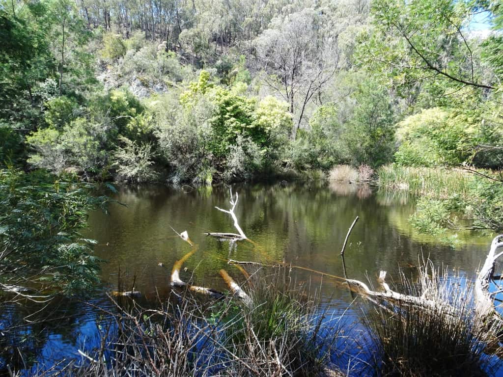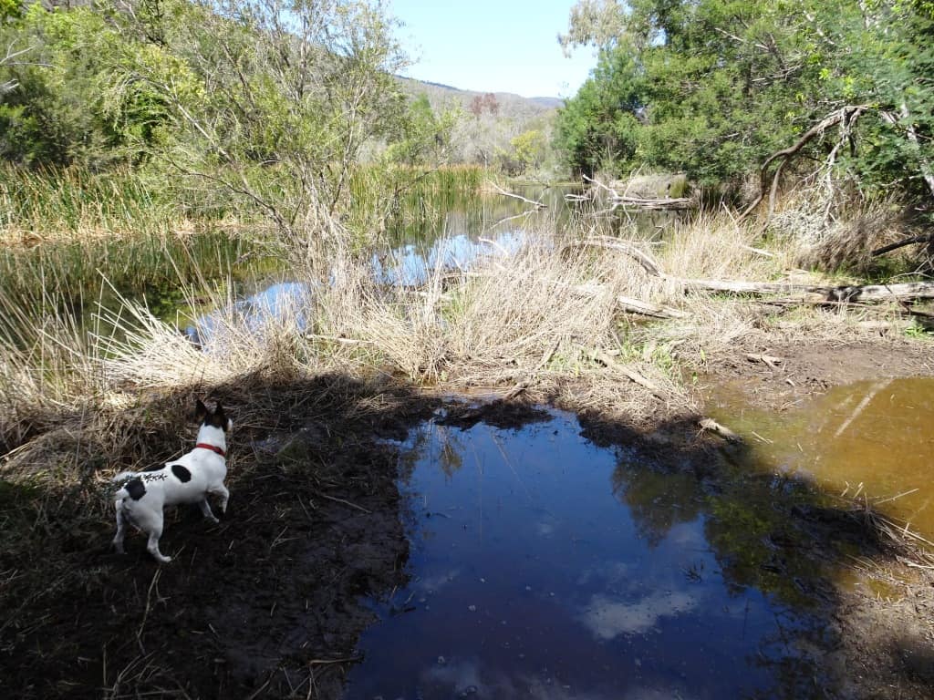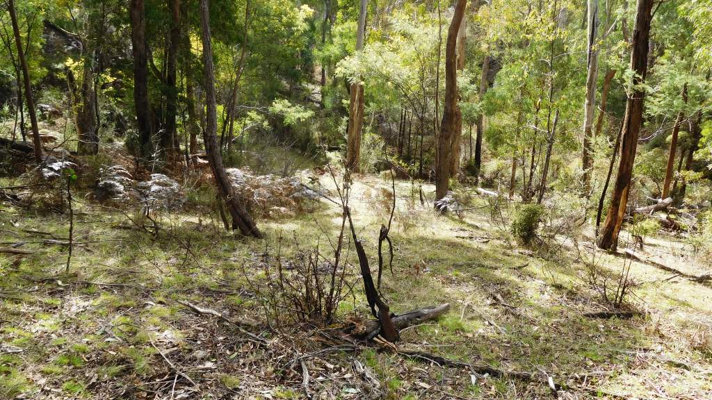 The deer will have cleared up the fire regrowth in less than ten years, but would I still be able to hunt this spot at 80? The grassy clearings here and there and wallows would be fine places for ambush hunting (if you did not have a dog with you!) but which I prefer not to do. Unsporting for the deer I feel. As I said earlier I prefer lamb anyway. And I really prefer to just see the deer nowadays. I would not enjoy hauling bits of them up those steep ridges anyway. Perhaps if I may make a permanent camp down here – a drum with an Intex raft, paddle, shelter, cookset etc, so I don’t have to carry so much stuff in – and out. I might be able to canoe this river during the summer and drop one off.