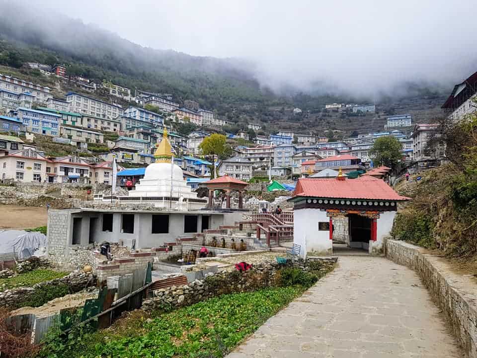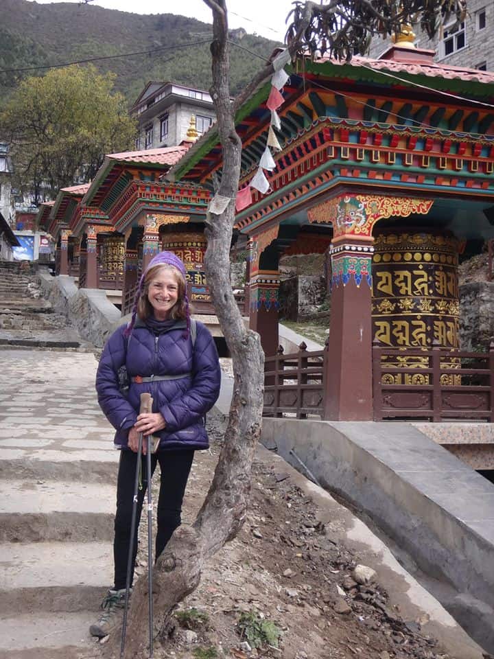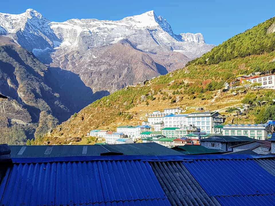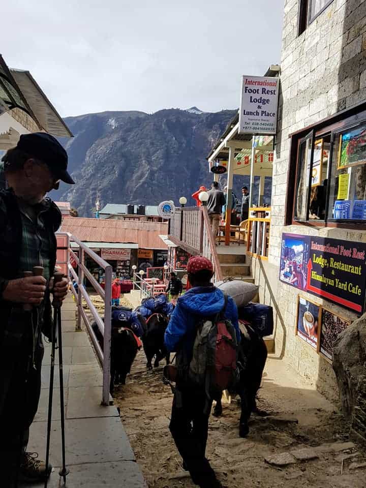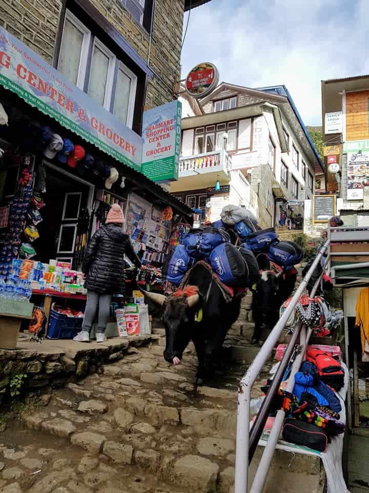 ‘Nestled on the sides of a hill, Namche is reached after a fairly tough climb. At over 3,400 feet, sensible trekkers spend an extra acclimatisation day there, climbing higher the next day and then returning to Namche to sleep, thus hoping to prevent altitude sickness. So we had plenty of time to enjoy this amazing town as well as wander over the nearby hillsides and villages.