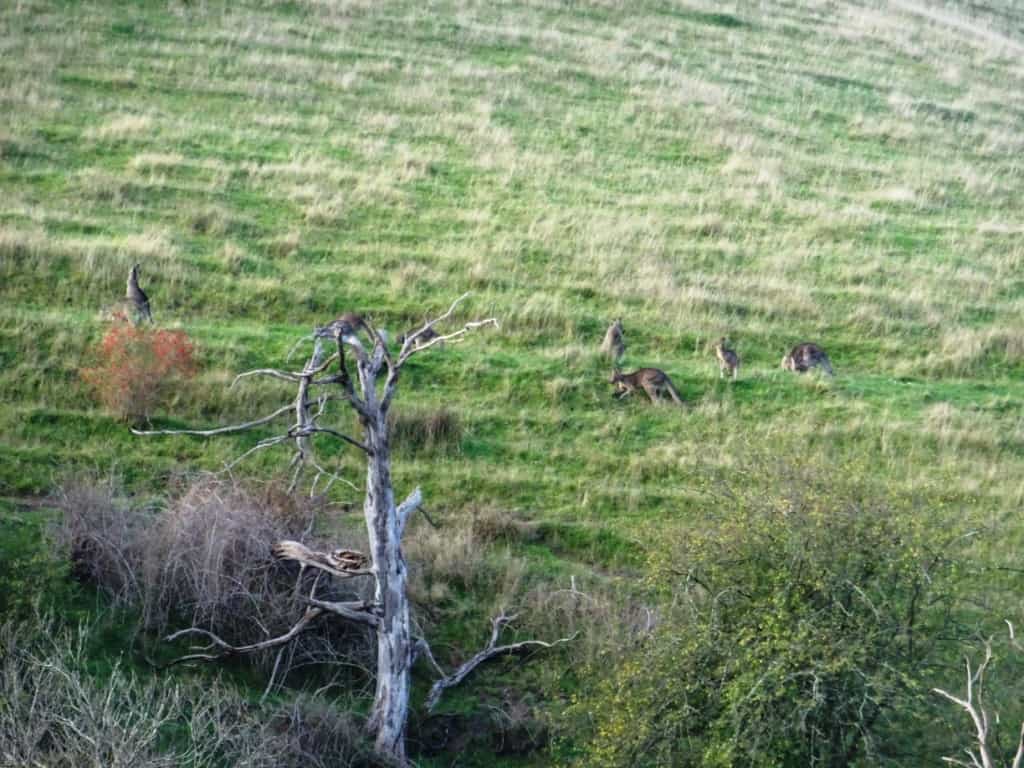 Western grey kangaroos on the hillsides. One of the chief reasons we are building wildlife-proof fences. They are breeding up alarmingly and will eat out all the feed in everyone’s paddocks soon. There is plenty of feed in their own bush, but they prefer ours. We will be making elevated ‘bridges’ for koalas and possums to get in.