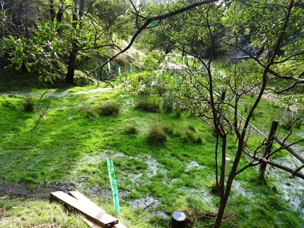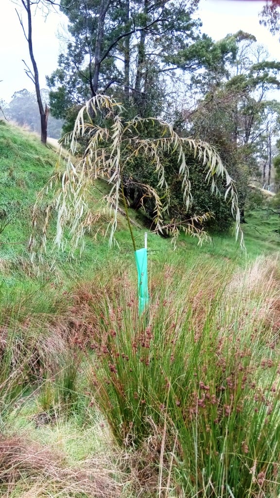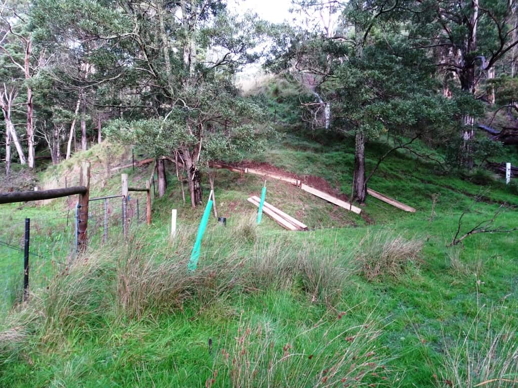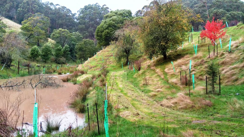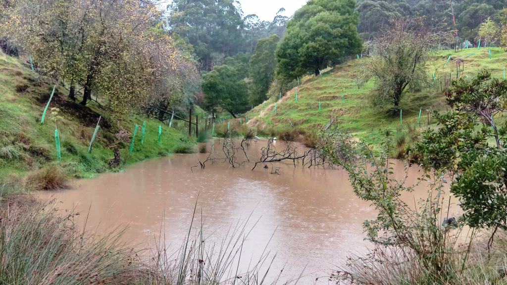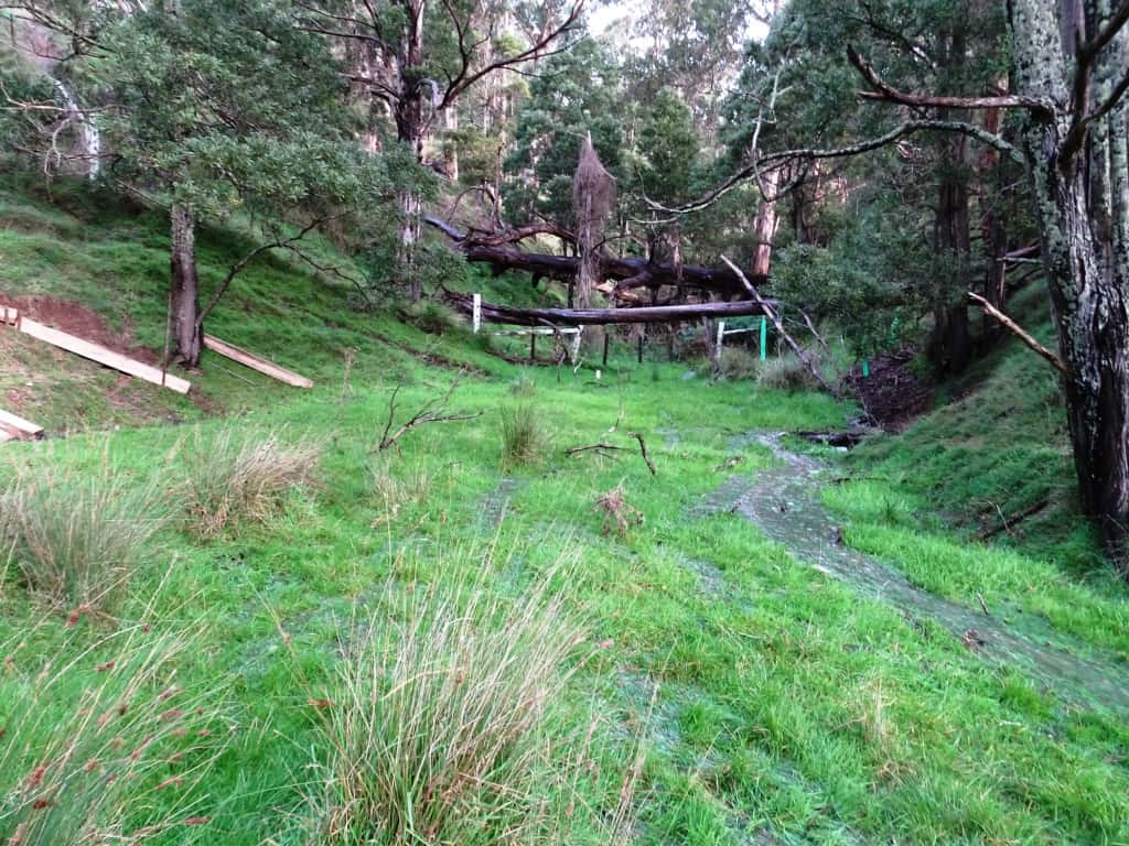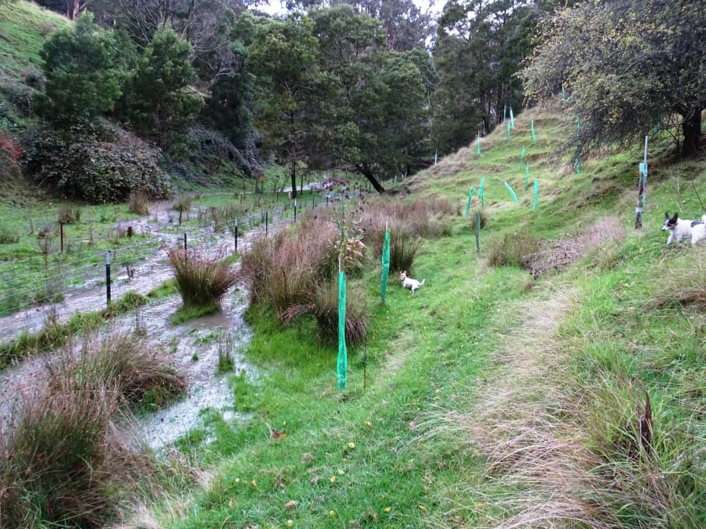 The bottom dam looking up the creek. You can see the old Blackwoods have just about finished and new trees are peeking out the tops of the (green) tree guards. For this method of tree planting read this.