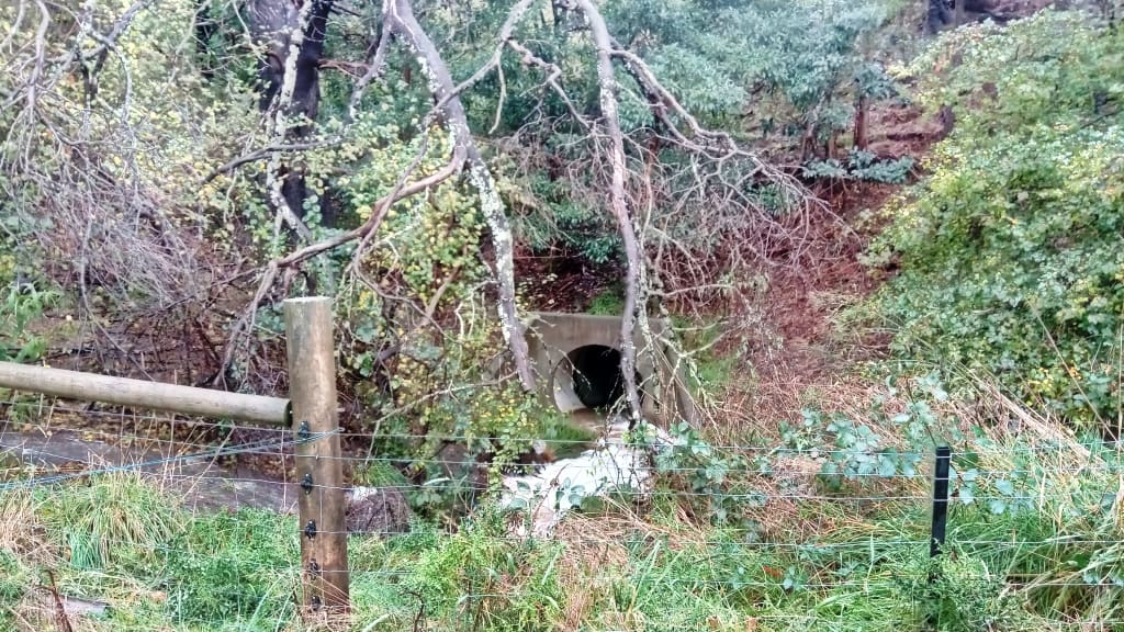 The 4′ concrete pipe under the roadway. bats and swallows love it. When I first came here I could still hear the calls of both creatures, but no more.