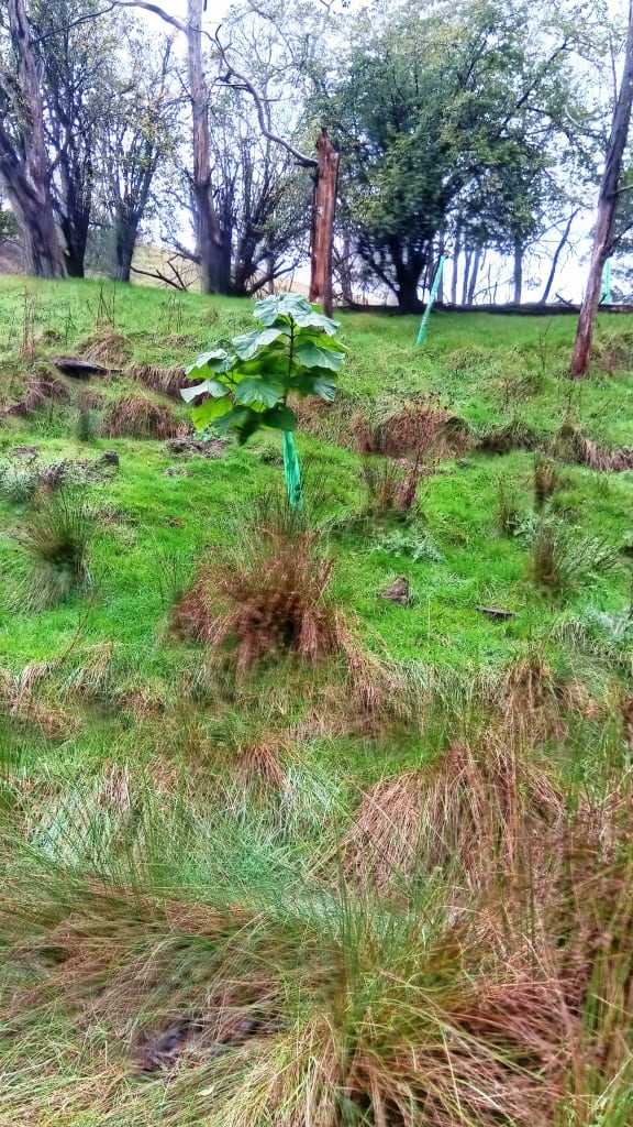 My daughter Merrin’s new tree plantings are shooting out the tops of the tree guards. Some have only been in a year. This is a Paulownia. The tee guards are 5′ tall.
