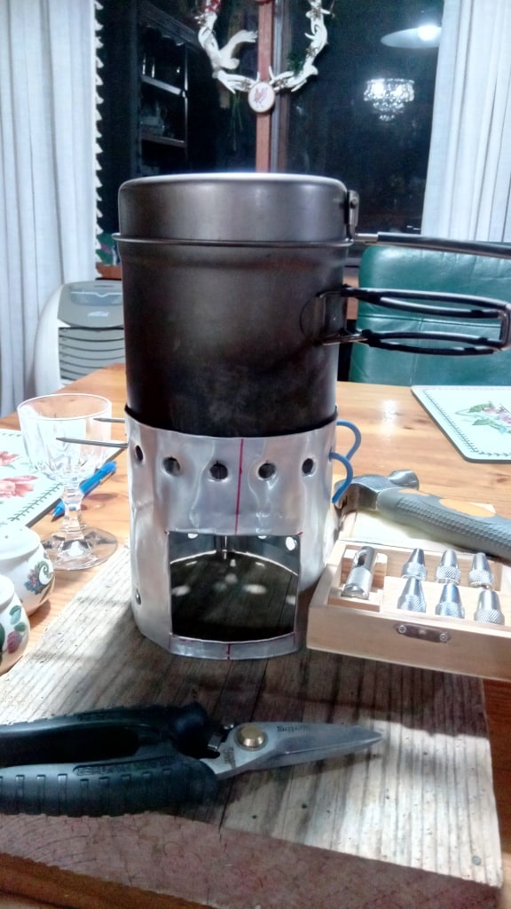 I have made this (exactly) just wider than my 1100 ml pot so that as little heat as possible escapes and so that I can make a carbon fibre cosy to conserve heat when I am burning alcohol in it (such as with one of Tinny’s Gnomes). Preliminary results show a saving of at least a third in fuel usage! I have ordered some fire-resistant thread (aramid) to sew the cosy up with.
