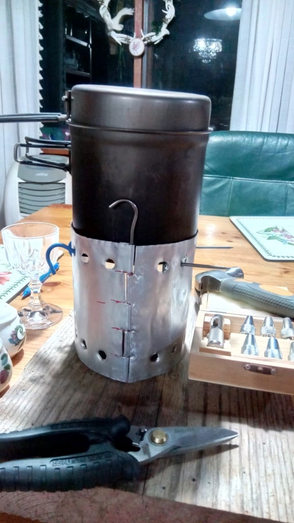 I have made this (exactly) just wider than my 1100 ml pot so that as little heat as possible escapes and so that I can make a carbon fibre cosy to conserve heat when I am burning alcohol in it (such as with one of Tinny’s Gnomes). Preliminary results show a saving of at least a third in fuel usage! I have ordered some fire-resistant thread (aramid) to sew the cosy up with.