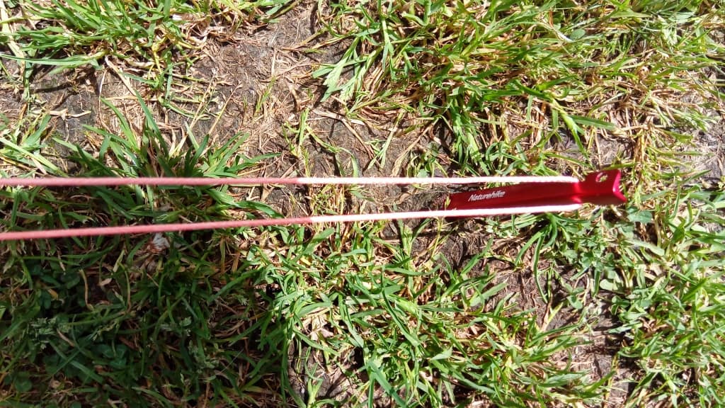 The shepherd’s hook pegs have a ‘tail’ (notice how the very end starts to bend outwards again?) which should be firmly in the ground so the peg does not turn (and the guy slip off). This also helps to secure it.