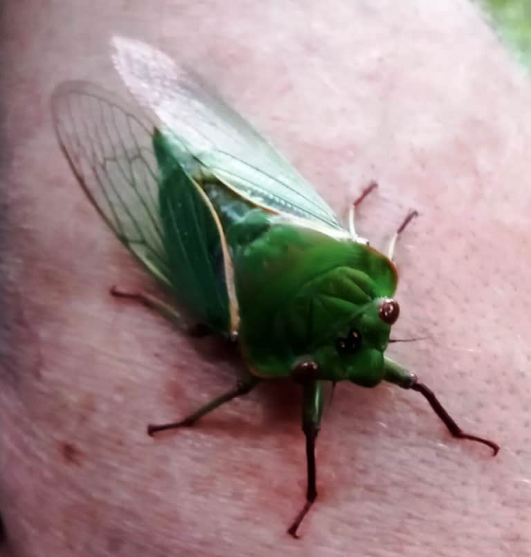 I was just doing some work clearing our new walking path in the bush up the creek behind our house yesterday (and again today) when this big guy suddenly turned up on my arm. I had been lopping some small branches with the machete and he must have been on one. Gave me quite a start I can tell you! He (or she) must be around 3″ (75mm) long – and what a delightful green colour!