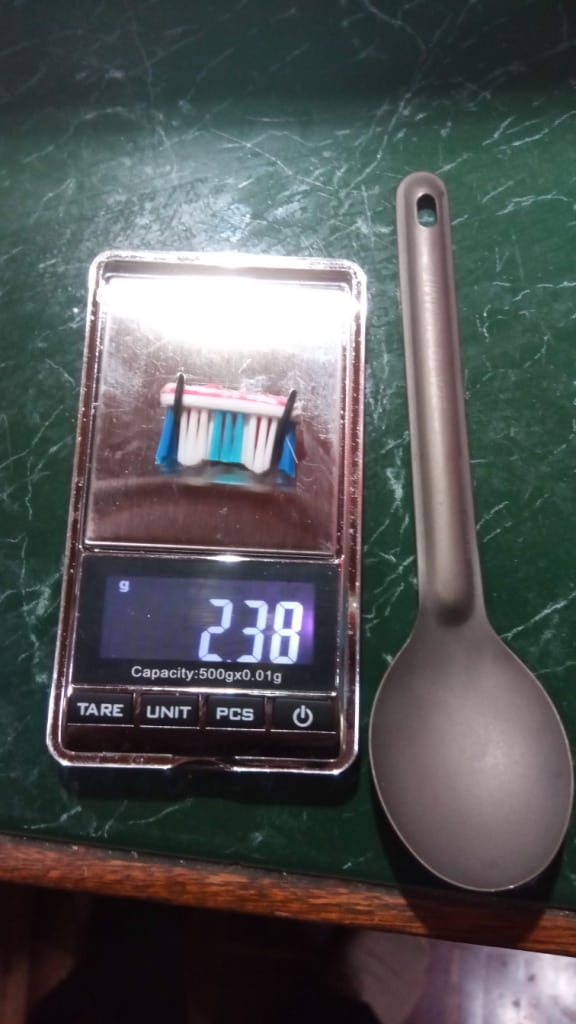 The patent for this idea was filed in 1934 so it is not my idea, but it is my take on it – and at 2.38 grams it works and saves you weight on your toothbrush. How low can you go? Just cut the toothbrush down then add a couple of small o-rings and voila! BTW: The handle I cut off weighed 13.6 grams!