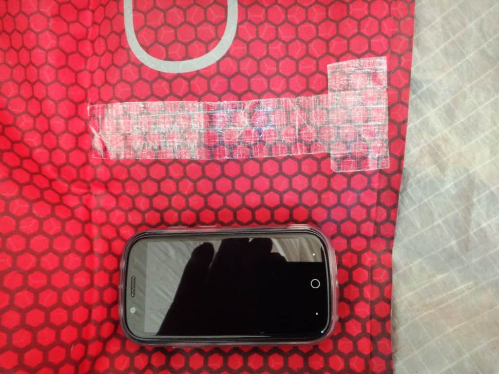 As you can see I have quickly and successfully repaired it with a strip of cuben tape, This is just about the best repair stuff I have ever found. I repaired Della’s down coat with it on the EBC when she nearly set it on fire!