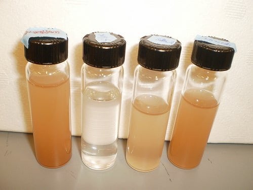 NB. All these samples have been filtered already. The clear one represents some very fine silk – as I said felt will do an even better job. It is what is normally used in urban water supply filters! Clearly once you get the water to the standard of clarity represented by the sample second from the left it will go through your sawyer etc t make it even better.
