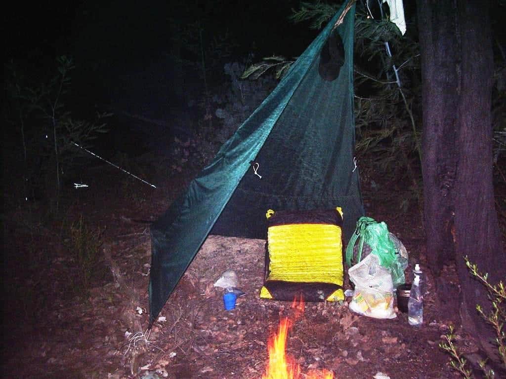This one is my old 7′ x 7′ hammock tarp (See Ultralight Hammock) which I have slept perfectly dry under on many an otherwise dismal wet night. I have it pitched a little high here for sleeping. This is my sitting pitch. I would drop it down when I was going to bed (and probably tie my raincoat at the entry in case it came in too wet). I was traveling pretty light there (twenty years ago) . I see that was a 3/4 length NeoAir at 260 grams (before my back got so bad) and a 230 grams cuben backpack.